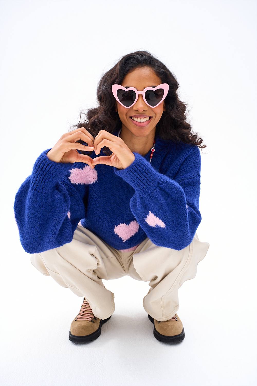 The Stranger Hearts Sweater is a piece that will warm up your wardrobe. The combination of navy blue and pastel pink creates a contrast you won't be able to ignore.
