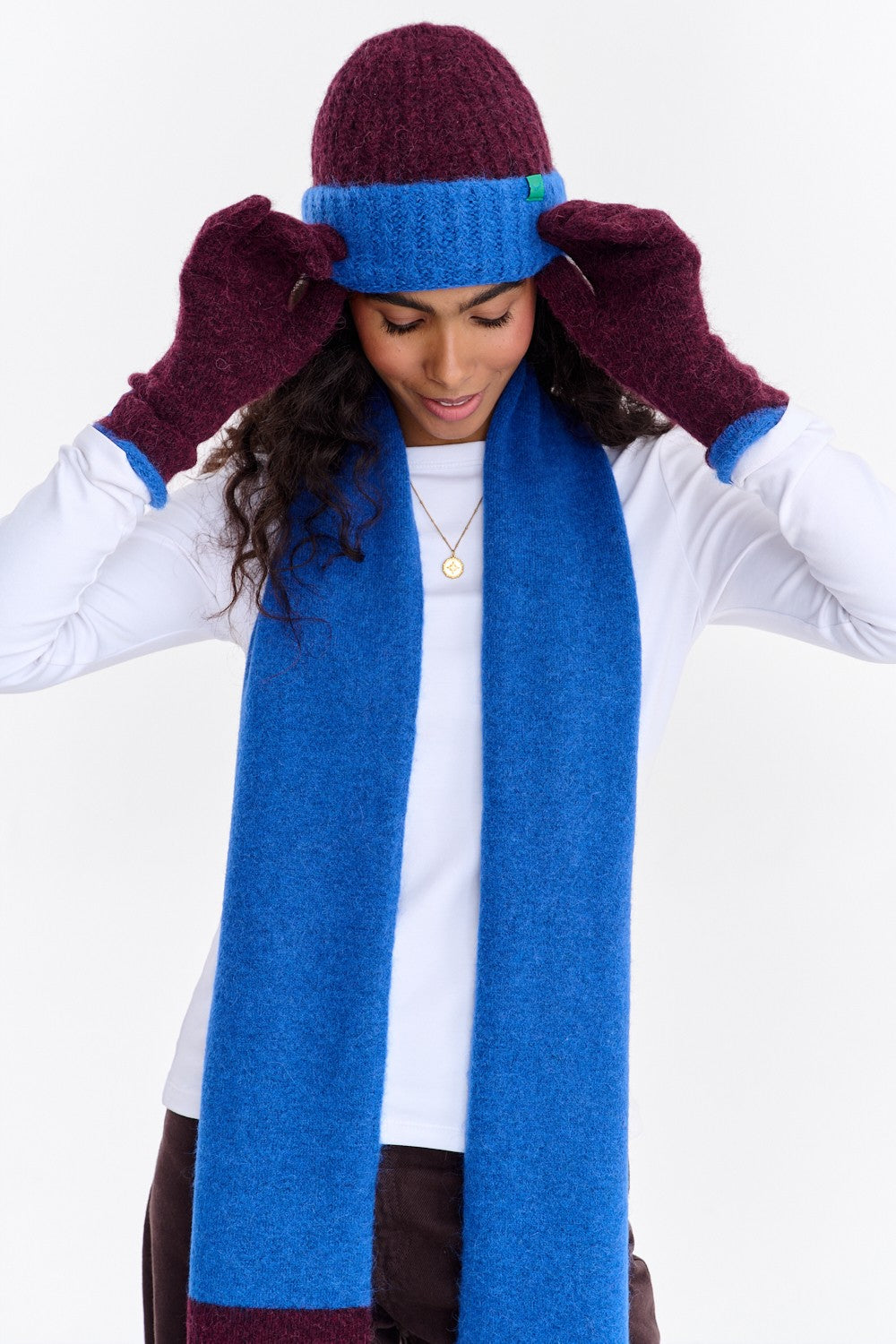 The DuoPuff Plum Ocean Scarf is an accessory that will add character to your winter ensembles. The design plays with the contrast of strong colors. The dominant deep blue is broken at the ends with a wide, ribbed stripe in a plum shade.
