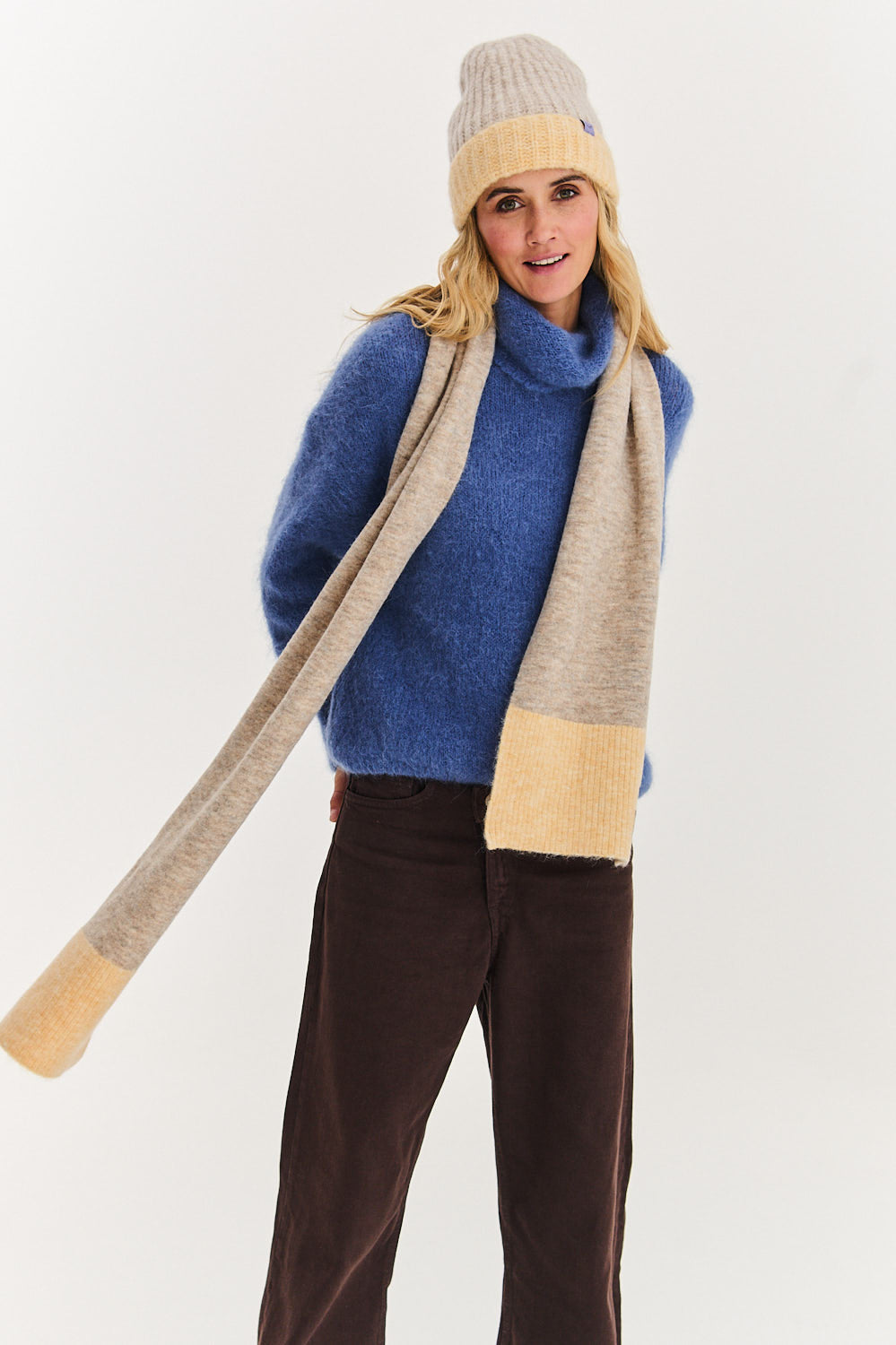 DuoPuff Sandy Morning two-tone scarf is the definition of winter elegance. The design is a harmonious combination of two neutral shades. The main part is a soft, mélange light beige, while the ends are finished with a ribbed knit in a warmer sand shade.