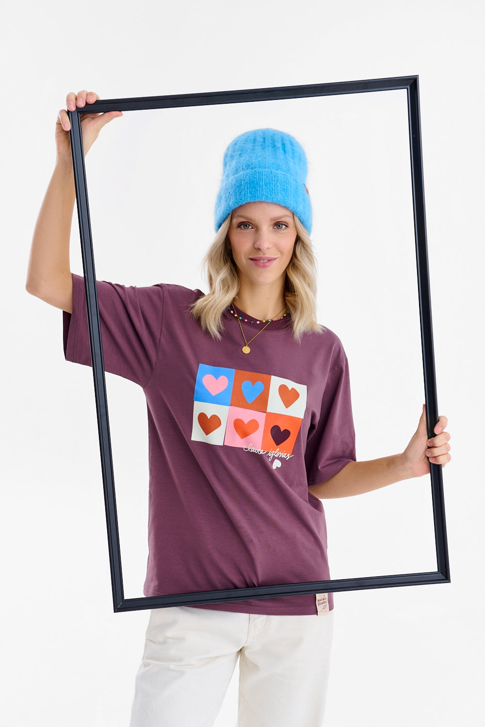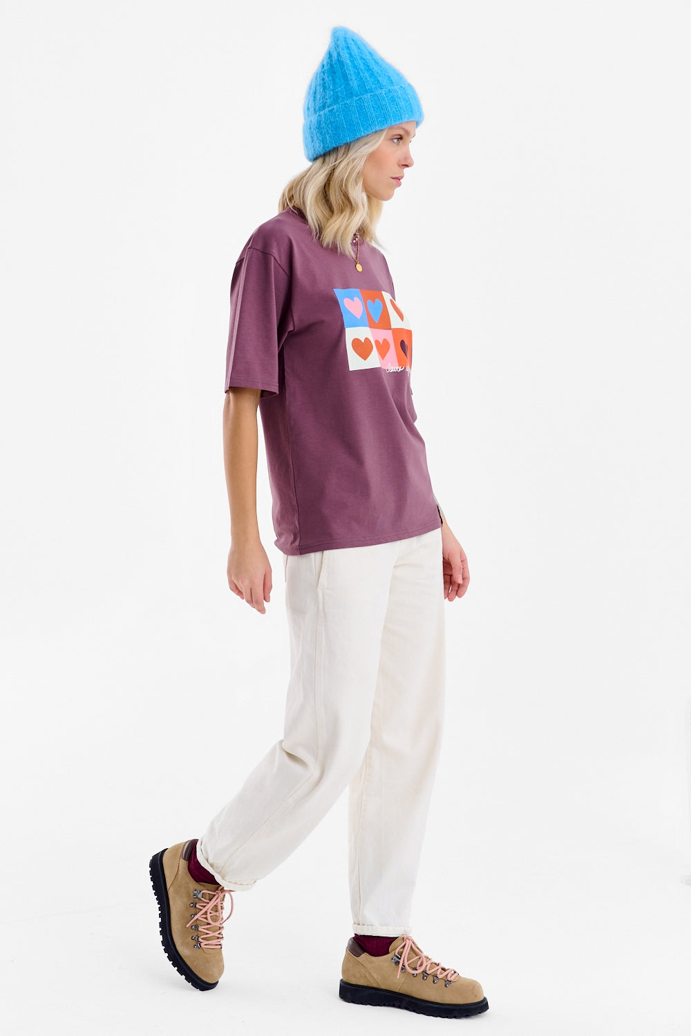 The Chocolate Love T-shirt is for women who love combining fashion with art. Designed by French illustrator Claire Iglesias as part of the Naoko x Artist Remix project, it features a deep, eggplant-like shade of purple and an oversized fit. It's the perfect base for an energetic graphic.