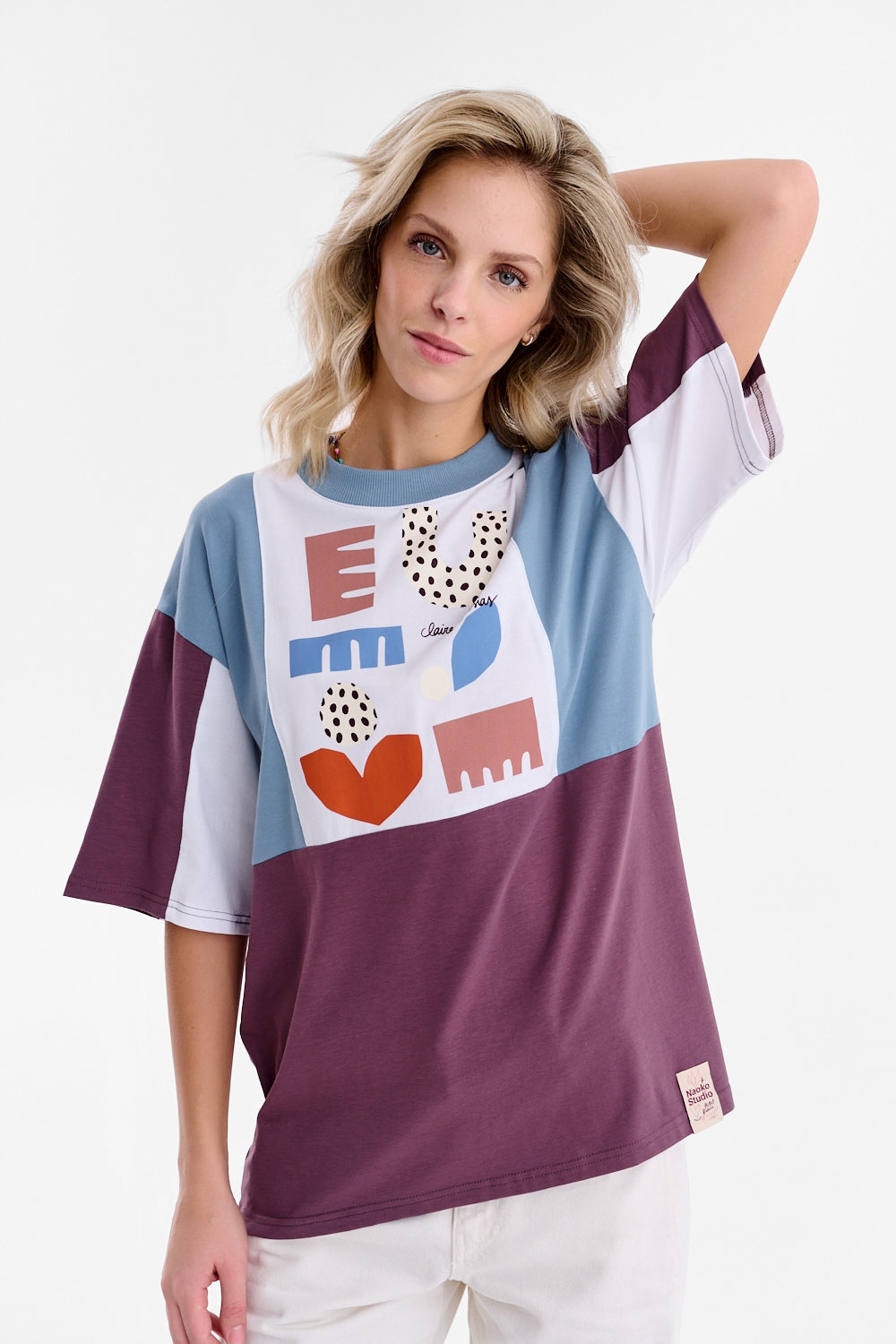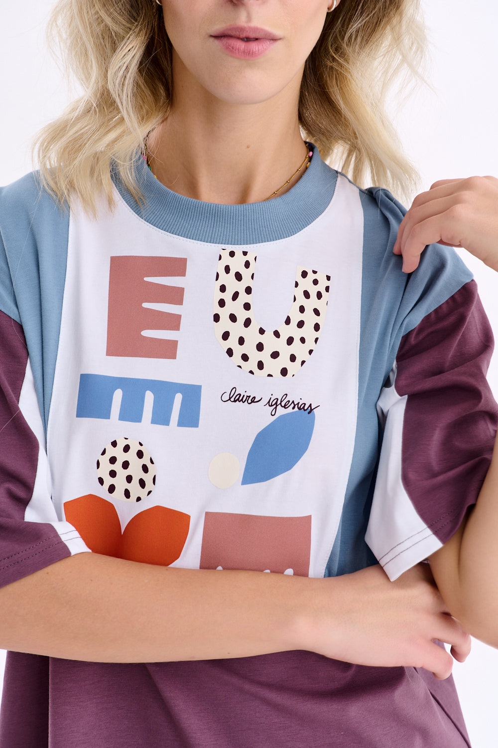 The Gallery Walk T-shirt is an invitation to a world of abstraction and color, created by Claire Iglesias as part of the Naoko x Artist Remix project. The French illustrator plays with form, combining panels of dove gray, white, and deep purple on an oversized T-shirt. This provides a backdrop for a unique graphic inspired by contemporary art.