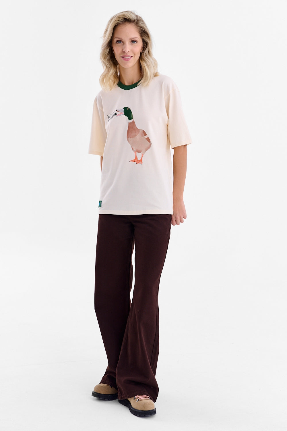 The Wild Quack T-shirt is a dose of Scandinavian humor straight from Cecilia Petterson. As part of the Naoko x Artist Remix project, the Swedish illustrator has created a T-shirt that perfectly captures the joy of free time. The cream T-shirt with a contrasting green neckline is a great base for casual outfits.