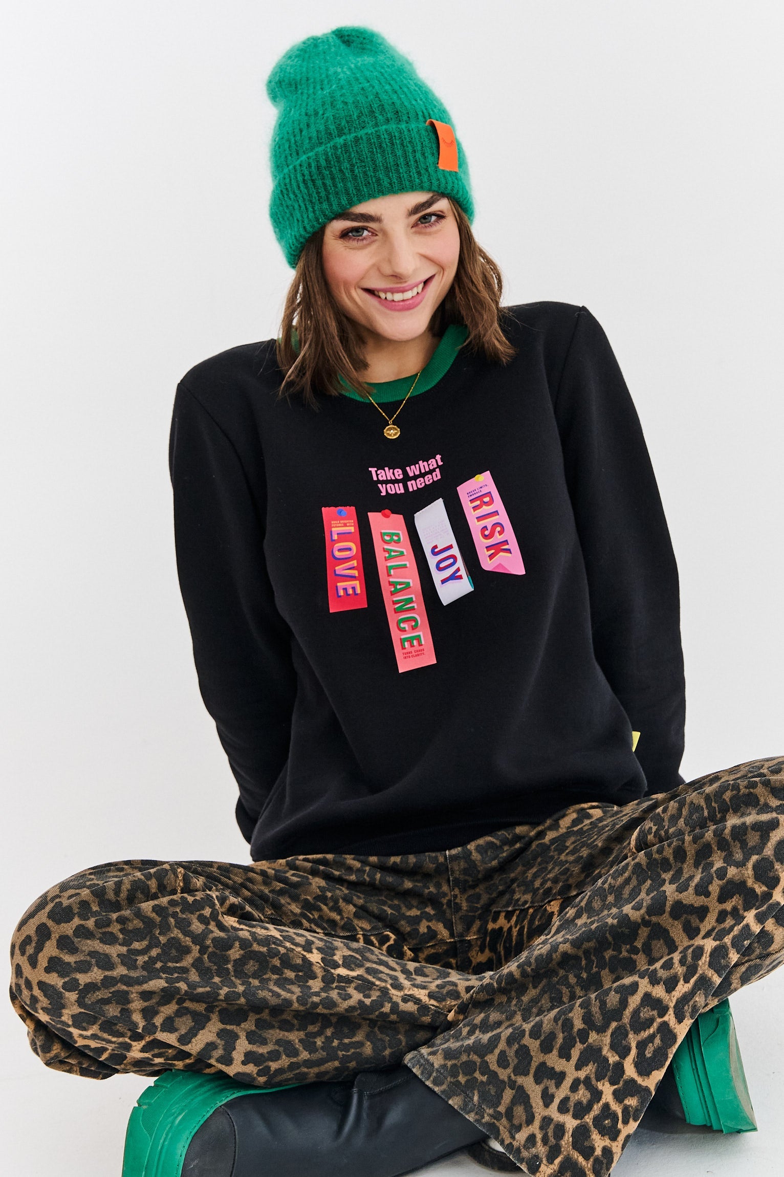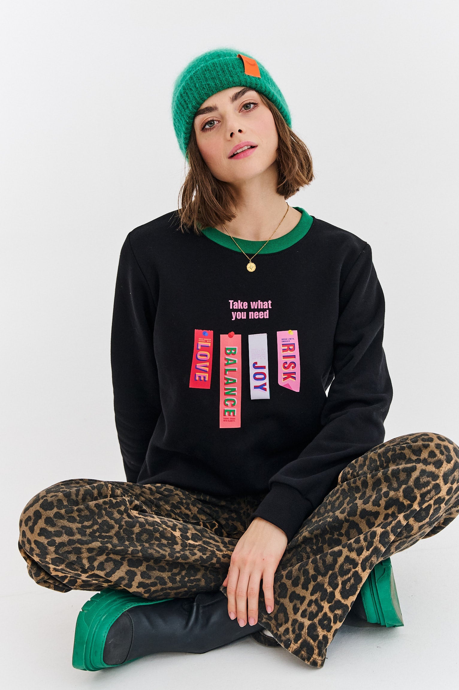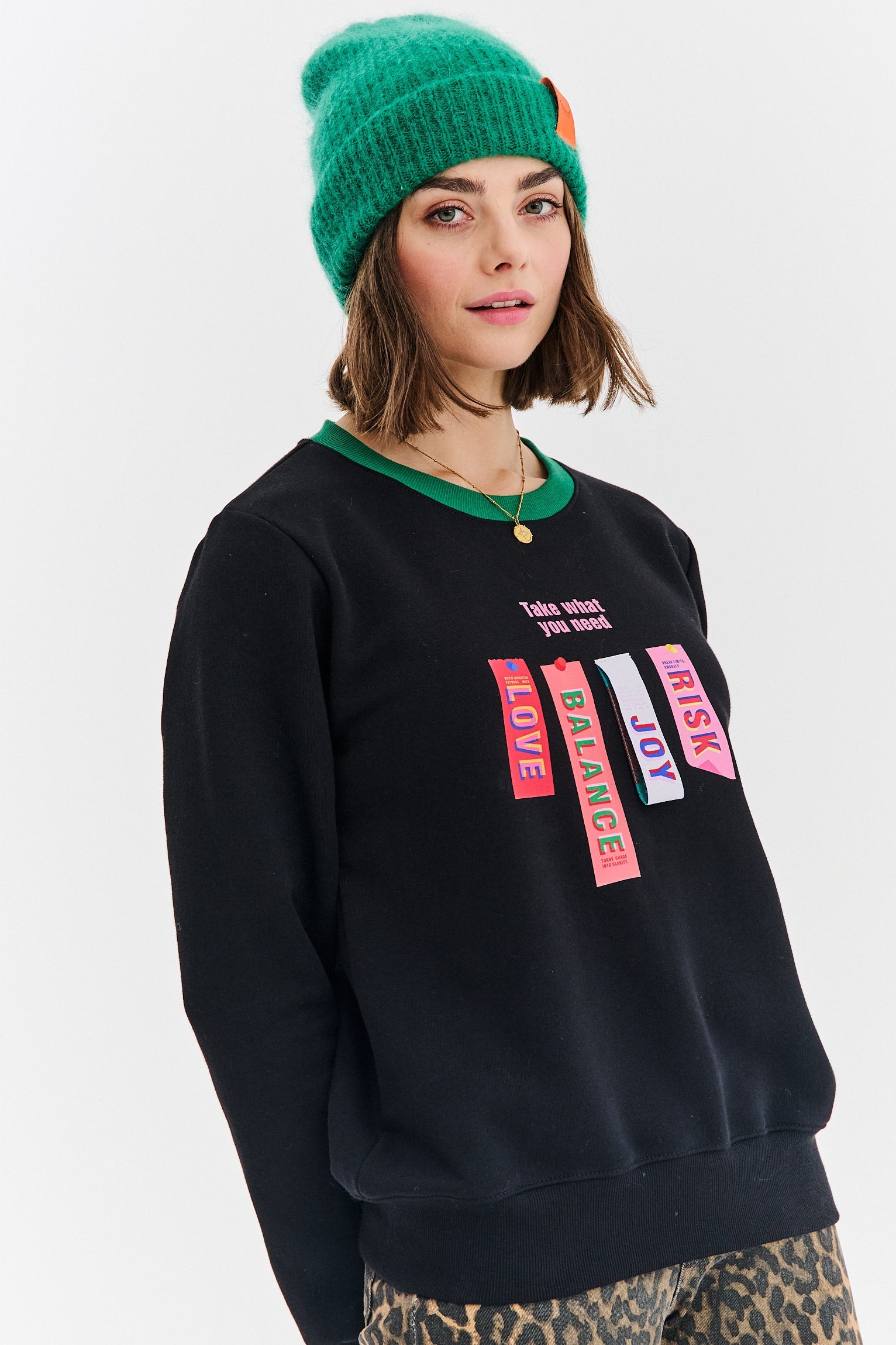 Take What You Need sweatshirt is a manifestation of good energy. Its design is based on strong contrasts – deep black, energetic green, and a multi-colored print. This is a piece of clothing that not only looks great but also carries a positive message.