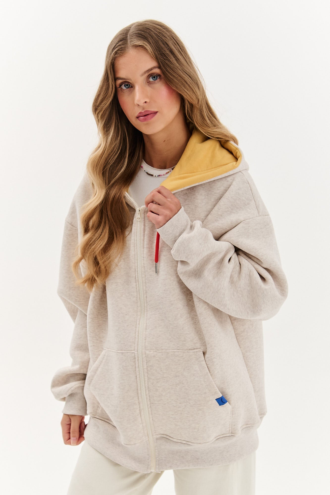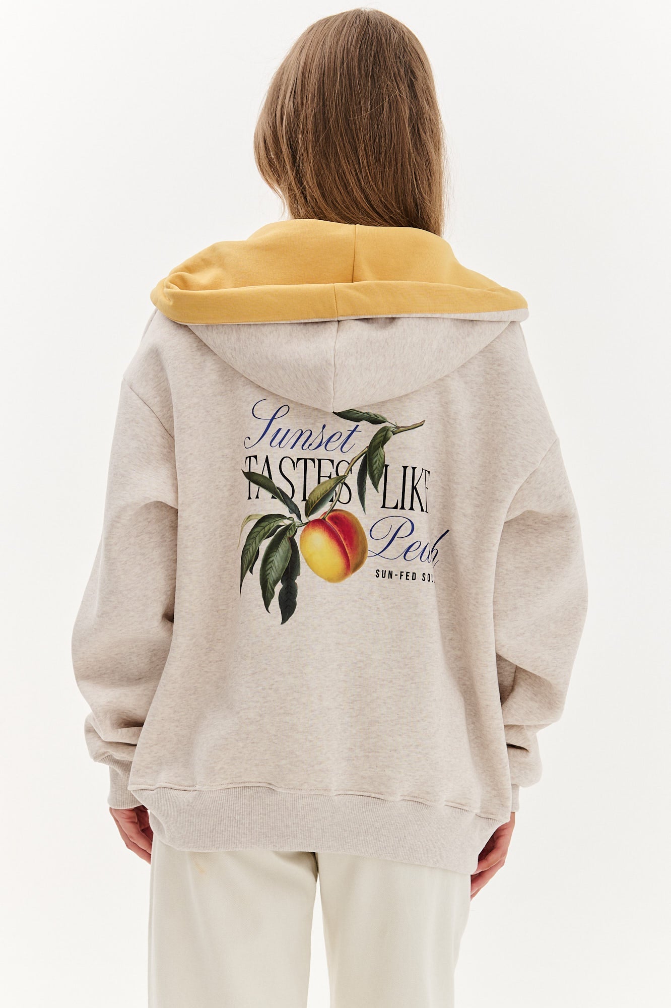 Taste Of Sunset unbuttoned sweatshirt is a casual proposal with a touch of poetic and holiday mood. The beige color scheme is broken with a peach print and the slogan "Sunset tastes like peach", which evokes the memory of summer evenings and sweet laziness. The model has a comfortable hood, soft drawstrings and roomy pockets - a classic in the NAOKO climate, but with an artistic twist.