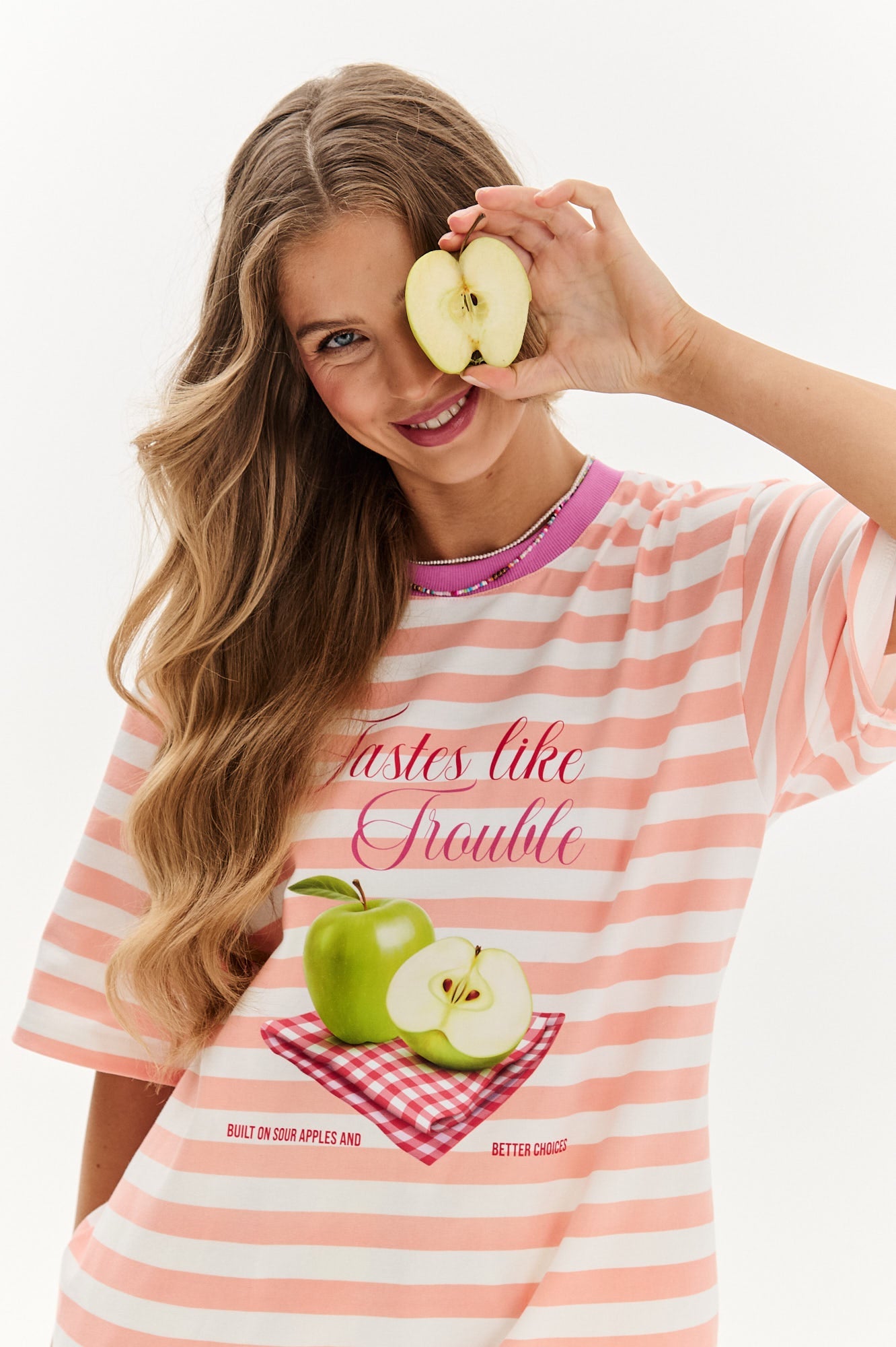 Egg Dealer T-shirt blends pastel sweetness with bold humor. The front features a stylish hen in a headscarf and egg-print skirt, with the phrase "Local egg dealer – ask around" that's impossible to ignore. Pink and lilac stripes and a contrasting neckline complete the look.