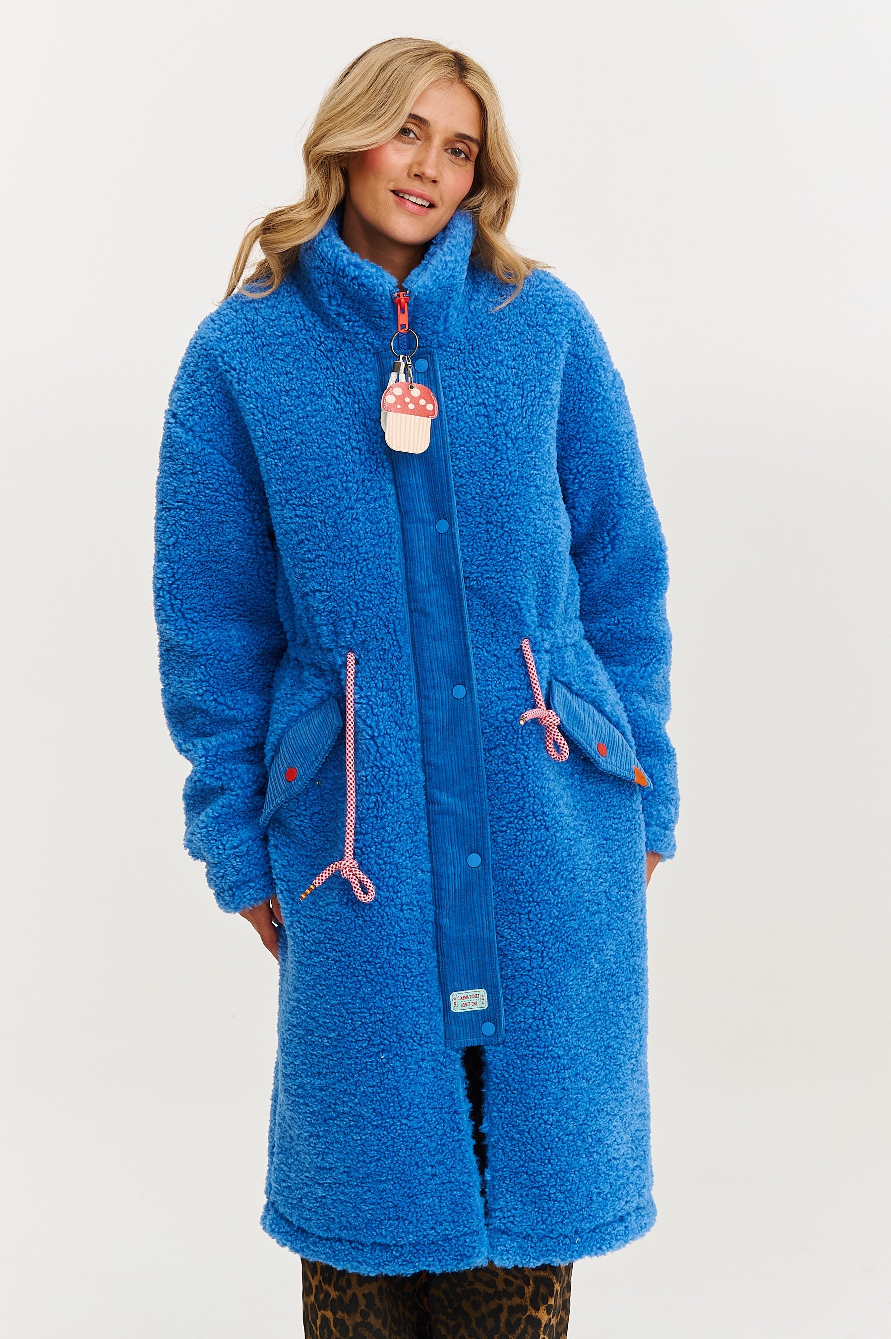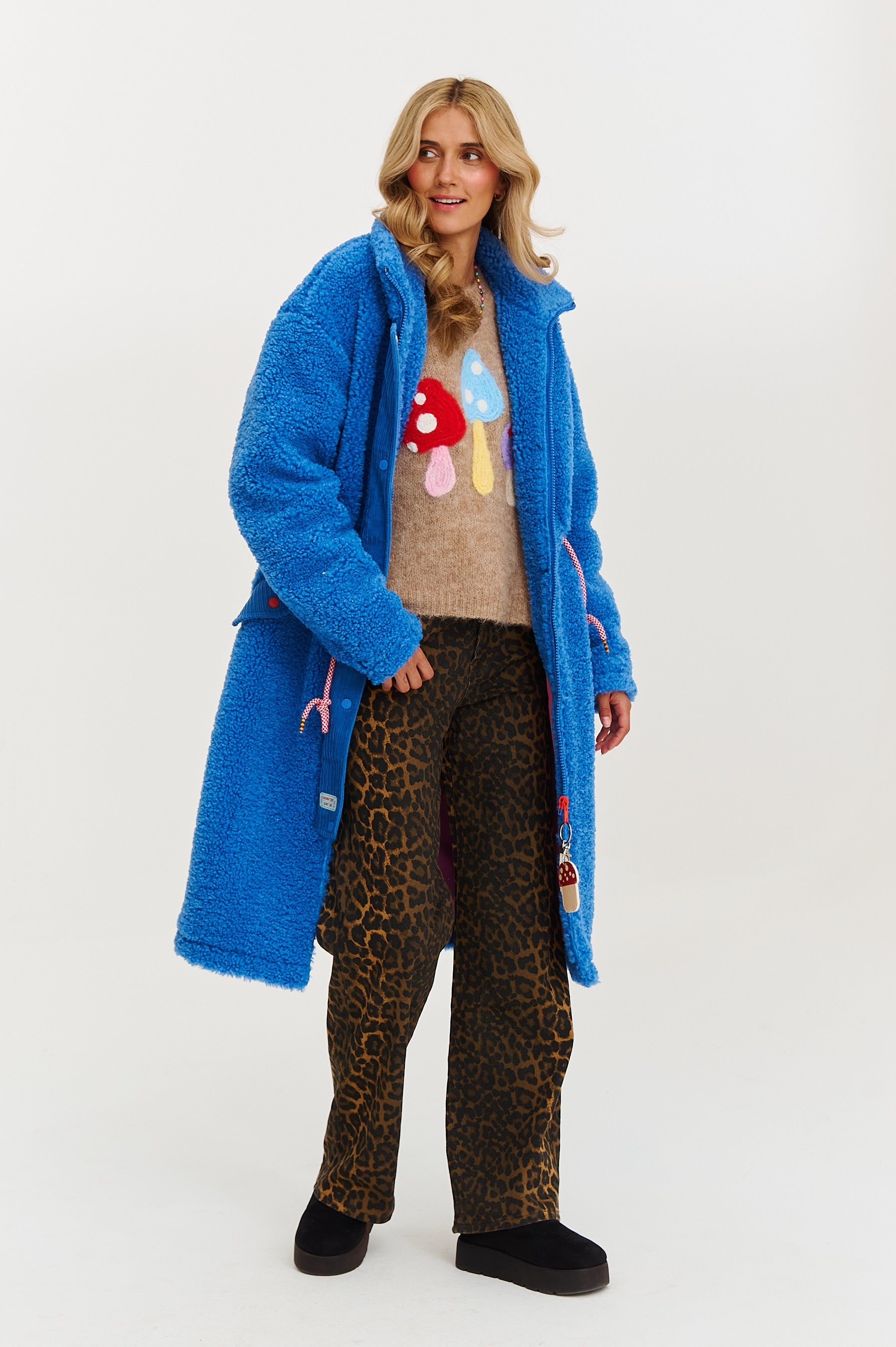 Teddy Puffin Blue coat is like a blue sky on a cold day – it energizes, envelops, and improves your mood. The long cut and plush texture make it perfect for fall and winter walks, morning coffee runs, and evening strolls around town.