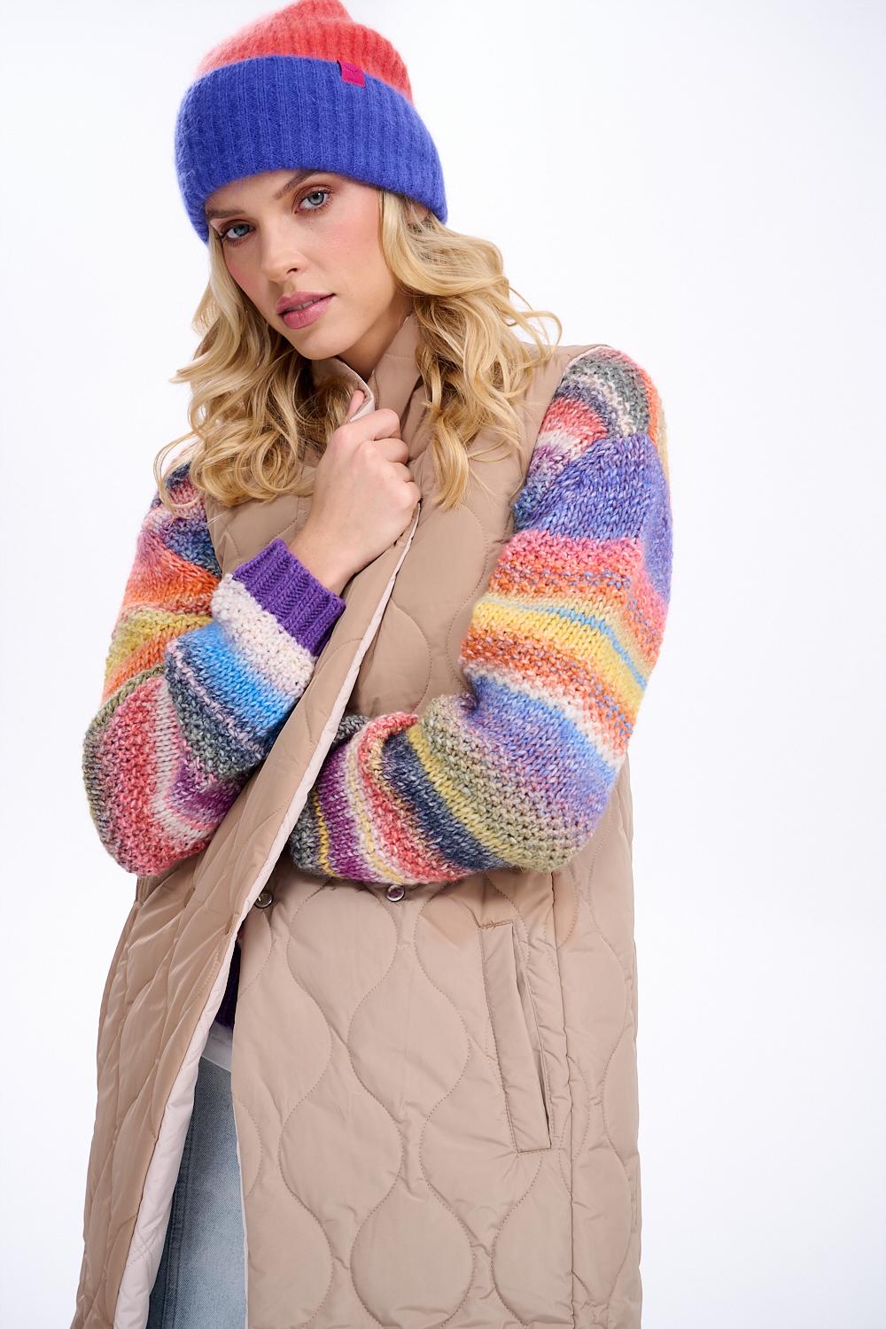 Toffee Maze long reversible vest combines warmth, comfort, and style in one unique design. On one side, it features subtle beige with geometric quilting, while the other side has a distinctive caramel shade and original pattern. Thanks to its reversible design, you can change your look in one simple move, depending on your mood or the occasion.