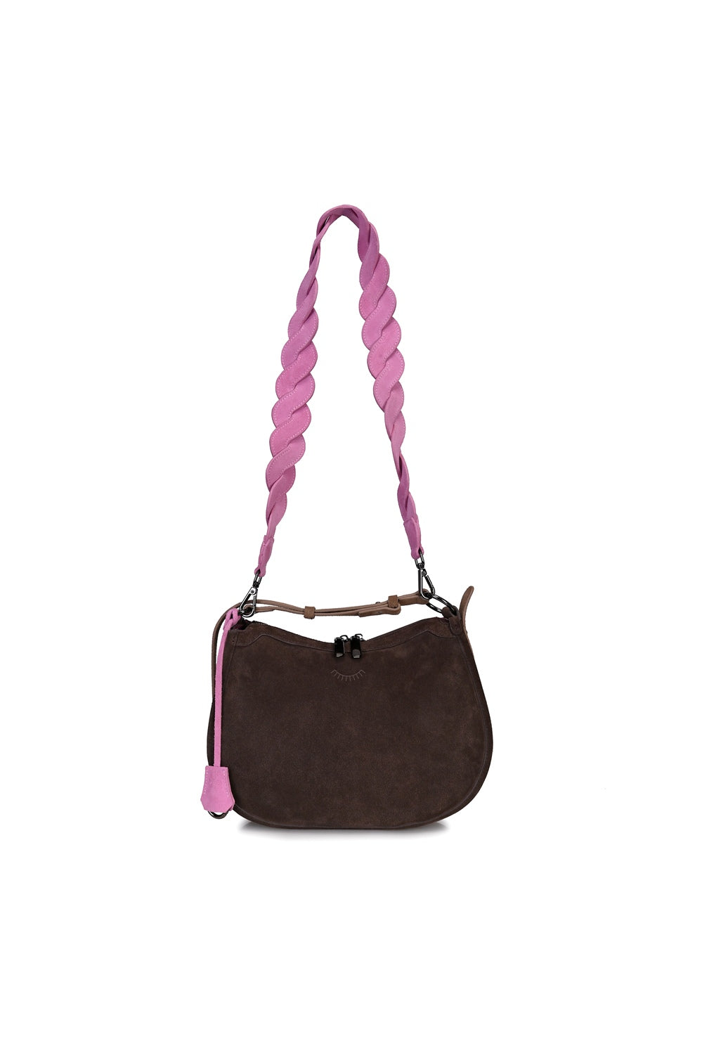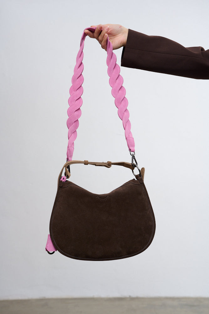 This crescent-shaped model is incredibly fashionable and comfortable. It has two straps to choose from: a long, artistically woven pink one, and a shorter, brown leather one. It's the perfect accessory for the woman who isn't afraid of color.
