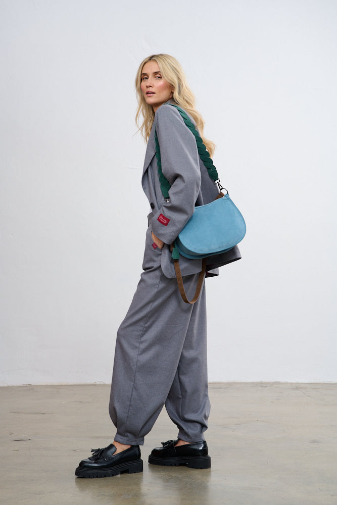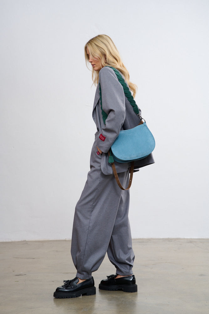 Riviera handbag is a combination of freshness and elegance. This fashionable crescent-shaped model captivates with its base color in a shade of blue. It is paired with classic brown suede accents and deep green details.