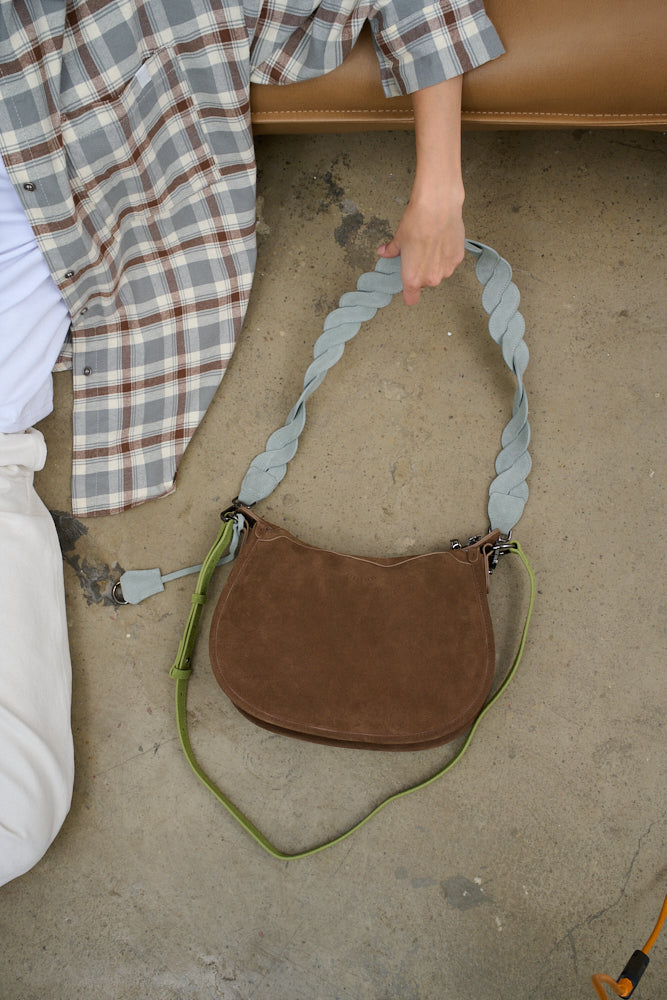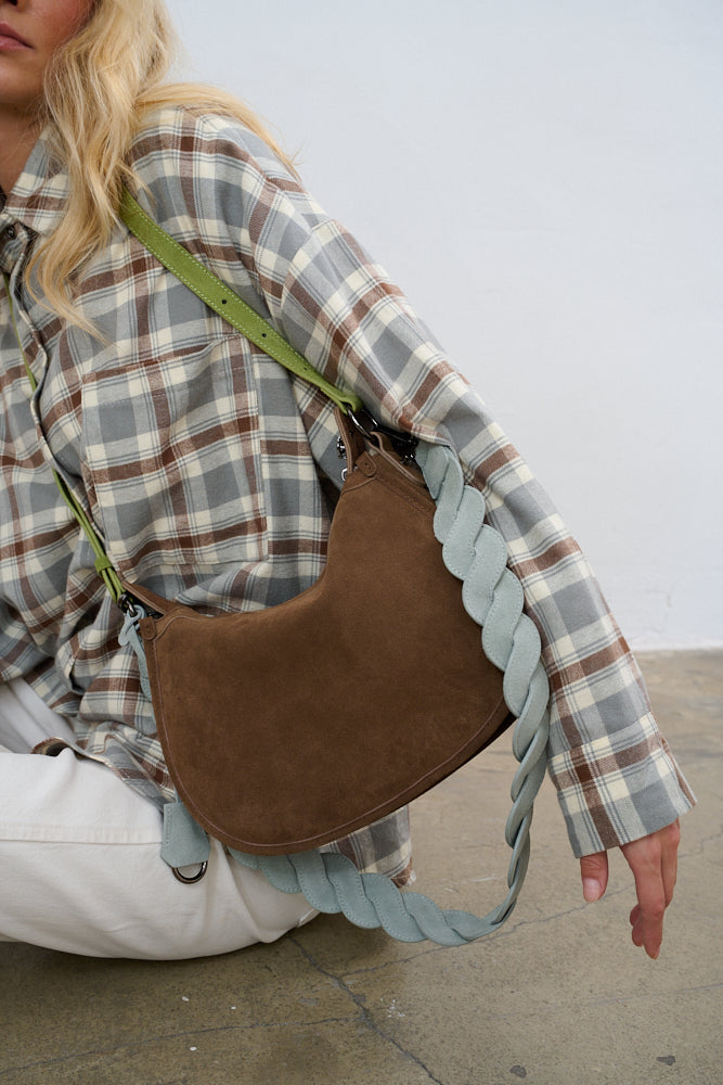 Soft Season bag is a tribute to natural colors and craftsmanship. This fashionable "hobo bag" is crafted from high-quality brown suede. Details in contrasting, calming colors add character.
