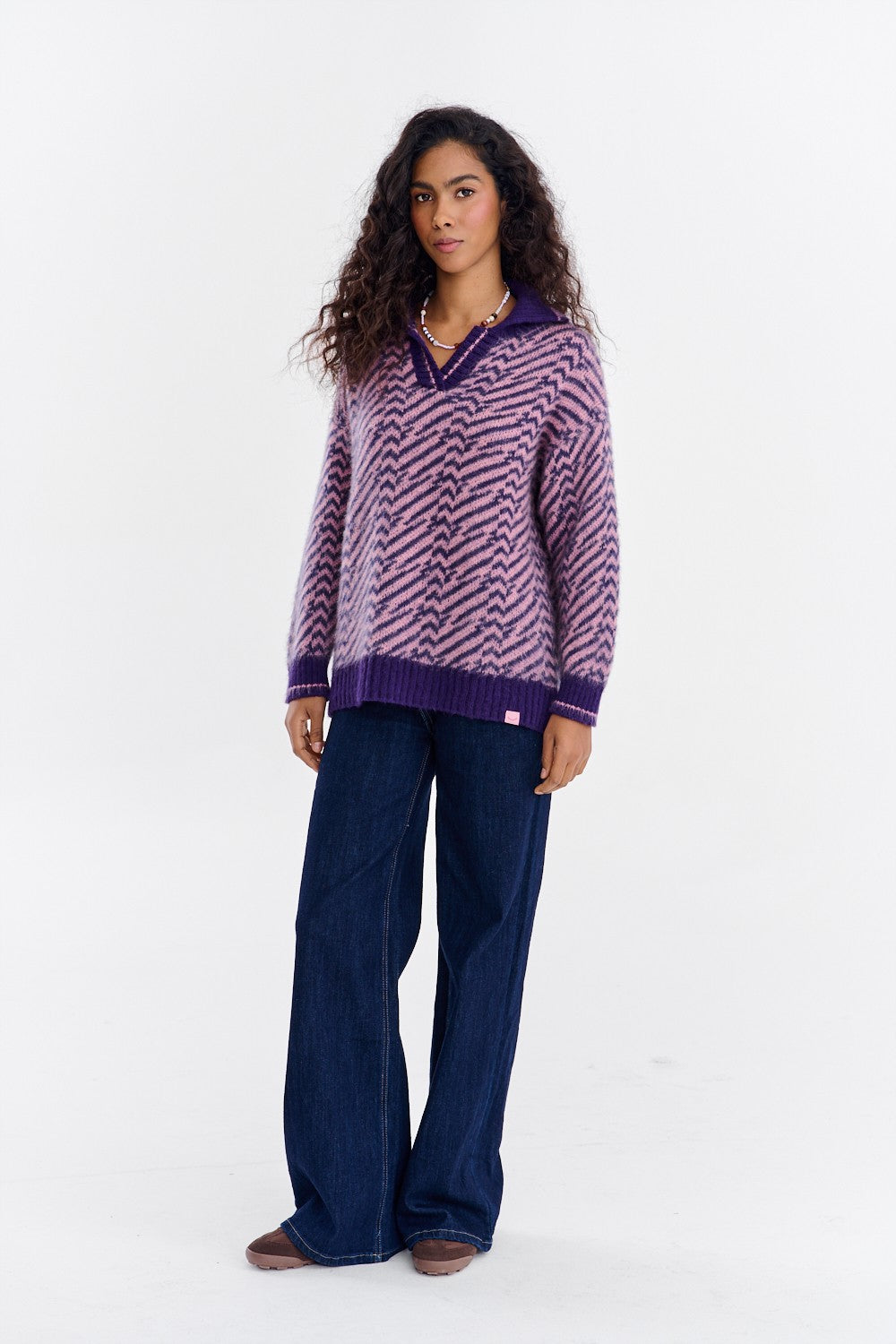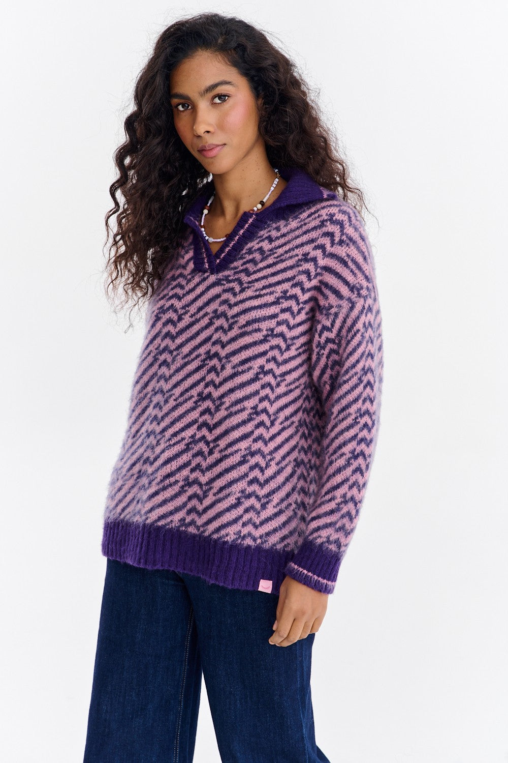 Thanks to the mohair blend, this sweater is incredibly soft and warm. The relaxed cut with a V-neck and polo collar is a preppy classic that will perfectly elevate everyday outfits. Wear it with jeans for a pop of color, or create a total look with other shades of pink and purple.