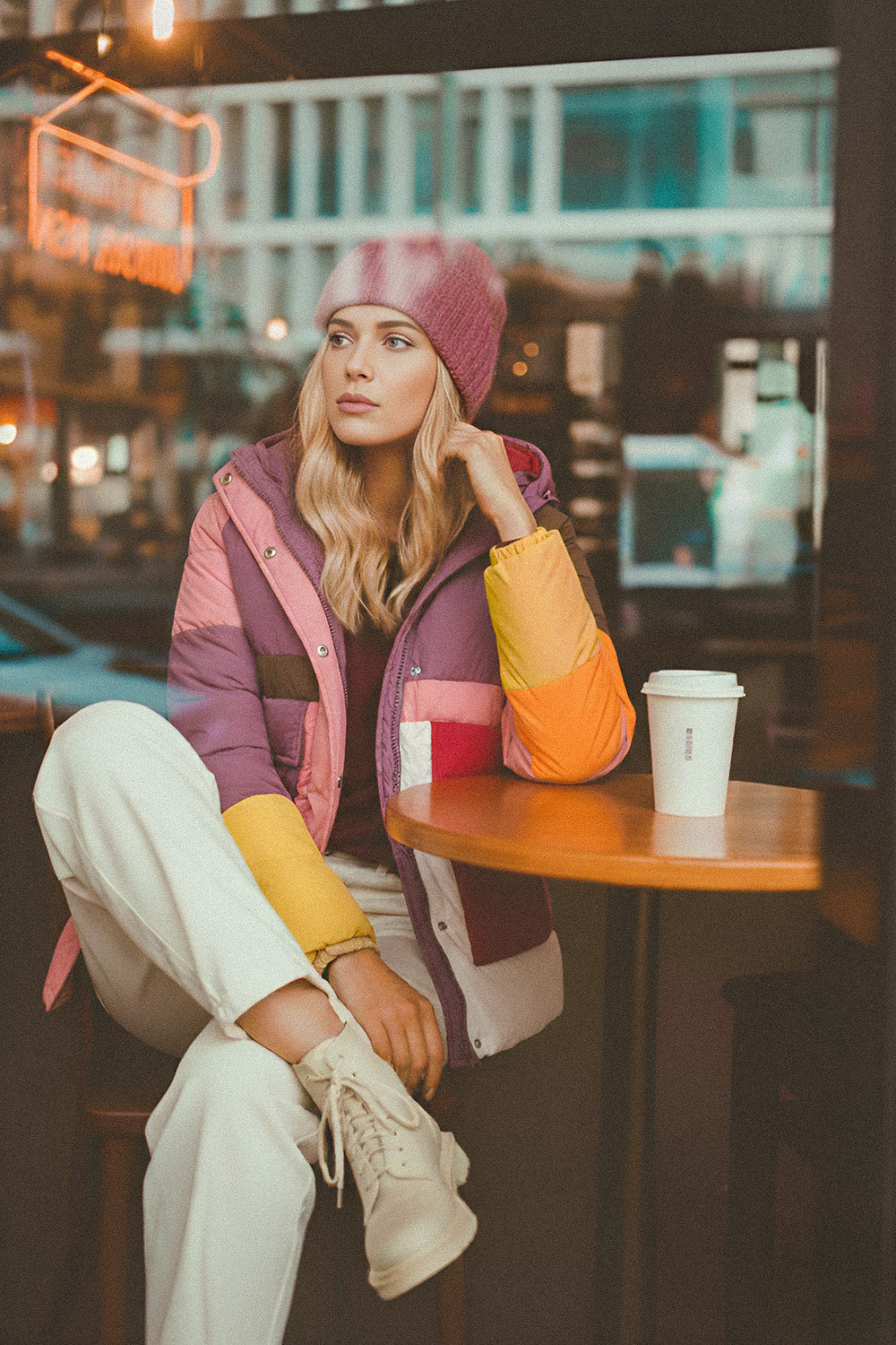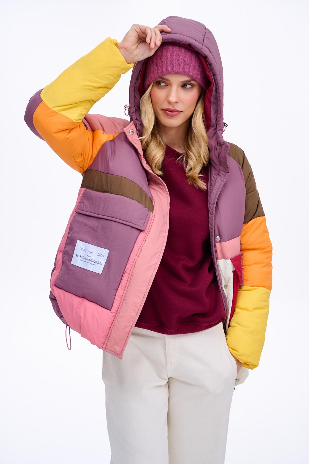 Tromso Color Pop jacket is an artistic interpretation of a winter parka. Instead of a single color, it features a mosaic of warm hues reminiscent of an autumn landscape and a sunset. It is an option for women who like to stand out but appreciate a cohesive and harmonious color palette.