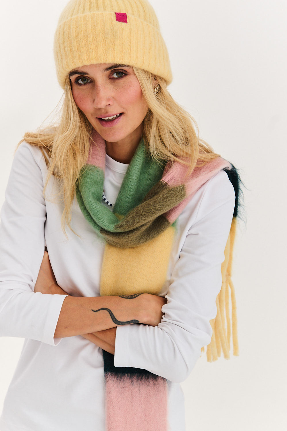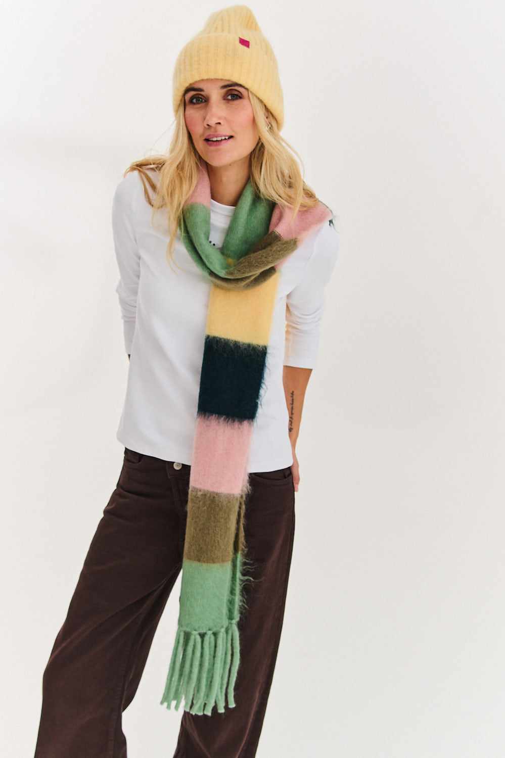 The Vintage Popsicle Wide Scarf is a modern take on '70s nostalgia. Its color palette combines powdery pastels with dark, deep shades, creating a unique color combination. The scarf is incredibly soft and warm.