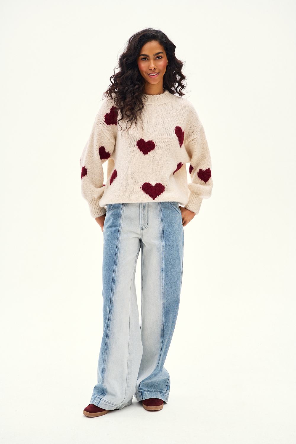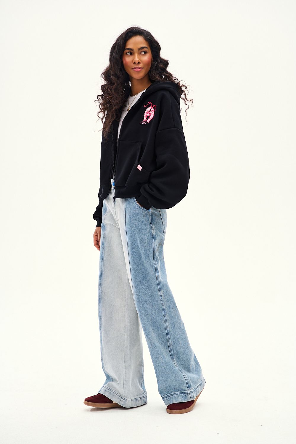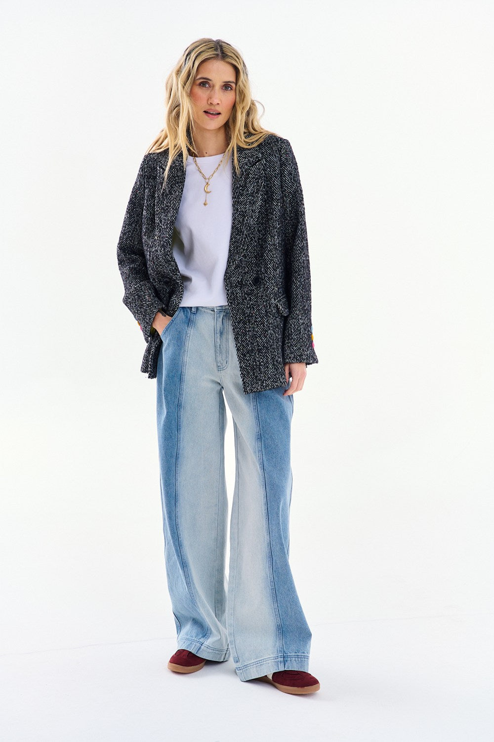 Secret Shine wide-leg jeans are a nod to vintage fashion and upcycling. The distinctive combination of two shades of denim in vertical panels creates a unique design that shapes the silhouette. The high waist and wide leg ensure comfort and the season's trendiest look.