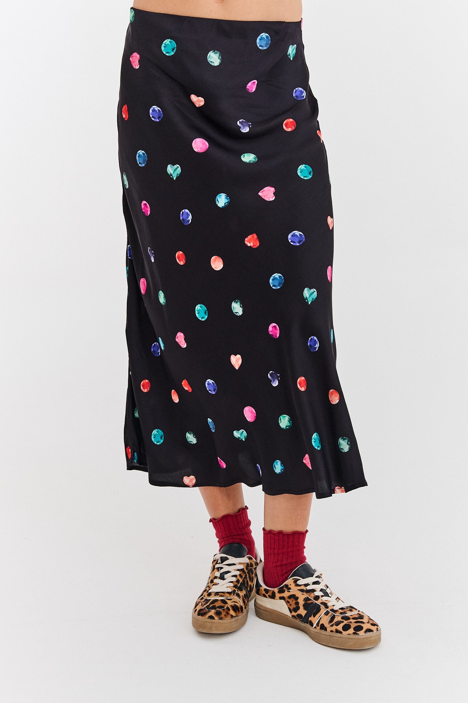 Midi sukňa Chasing Diamonds dokazuje, že klasika nemusí byť nudná. Jej tajomstvo spočíva v jedinečnej potlači, ktorá upúta pohľad a zaujme. Vyrobená zo 100% viskózového saténu je neuveriteľne príjemná na dotyk a krásne sa prispôsobí postave.