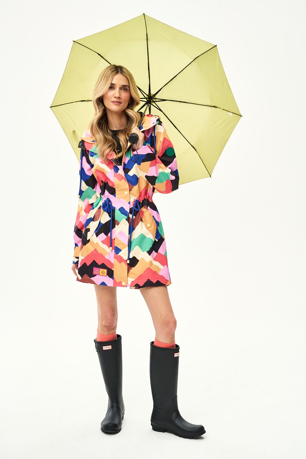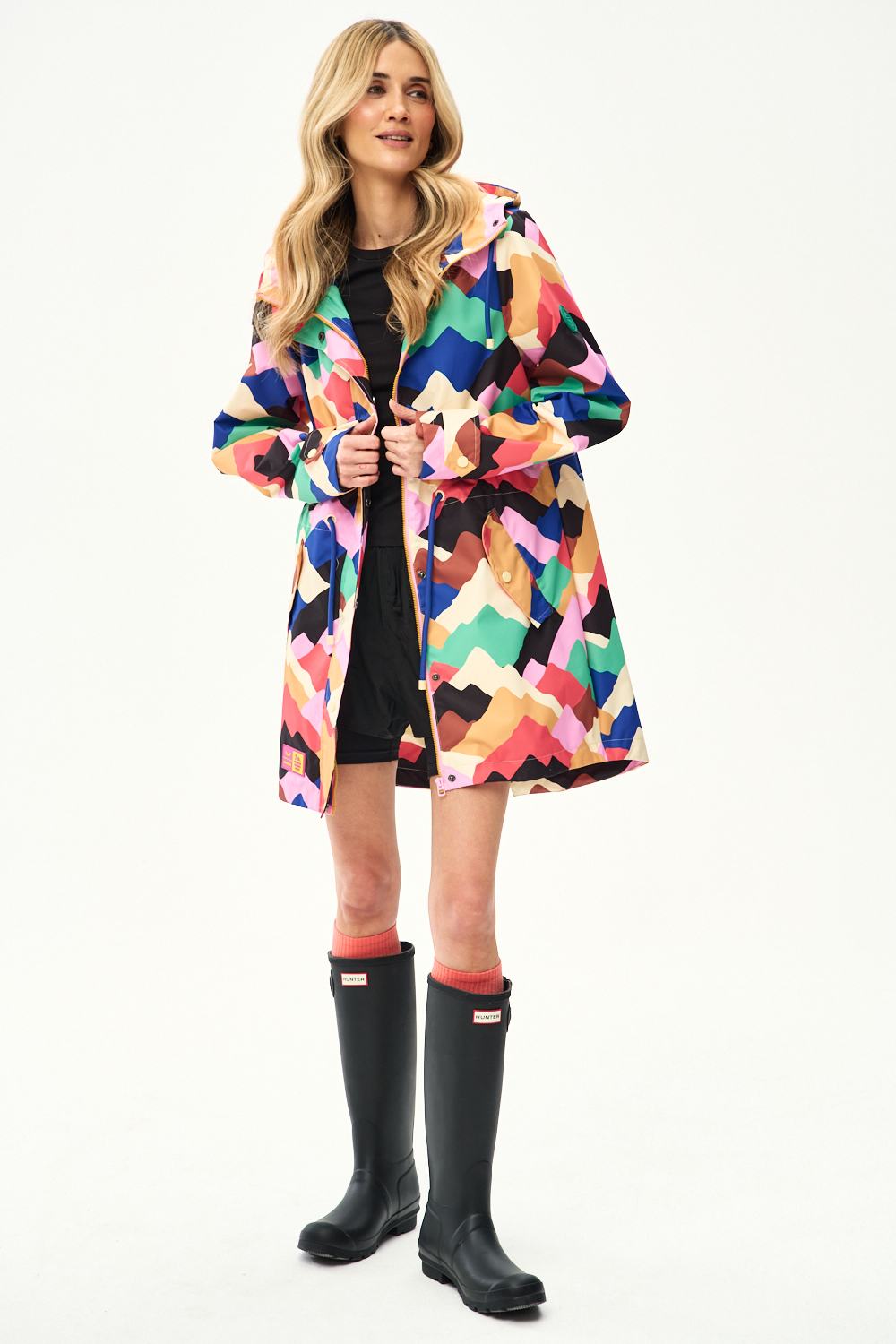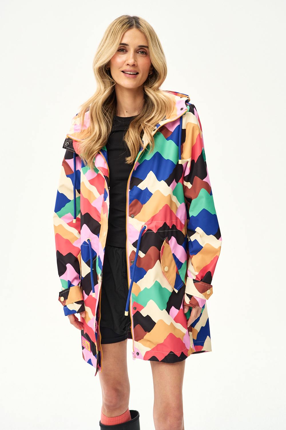 Plášť do dažďa Color Hike je skutočným obrazom na látke. Pestrofarebný vzor zobrazujúci hory v odtieňoch modrej, oranžovej a fialovej upúta pozornosť a inšpiruje vás naplánovať si ďalší výlet. Predĺžený strih parky účinne chráni pred vlhkosťou a zároveň zostáva ľahký.