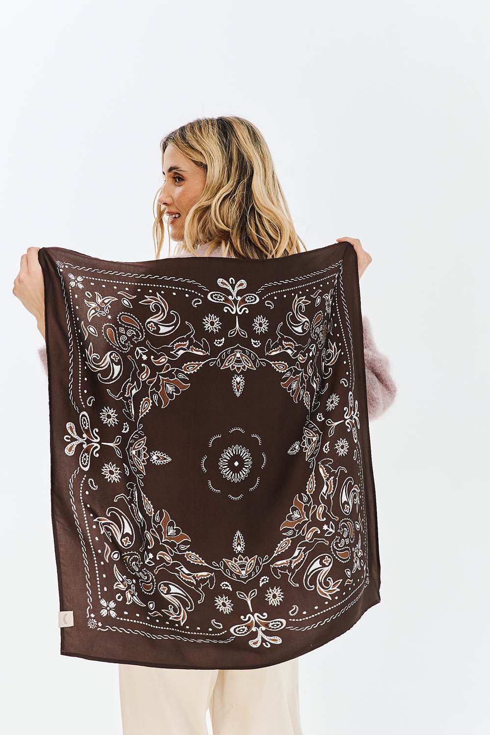 The Desert Darling scarf is the quintessence of the Western Romance collection. The dark brown background provides the perfect base for intricate, white patterns, with horse silhouettes gliding through them. This classic piece, thanks to its color palette, complements almost everything – from denim jackets to elegant trench coats.