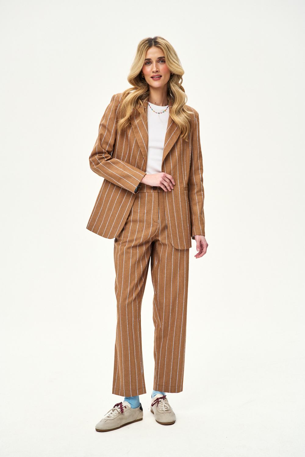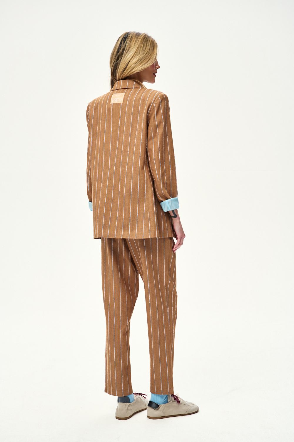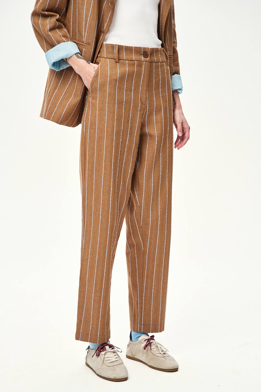 The Desert Wind pants are for women who value sophisticated style. The warm, sandy shade, adorned with delicate, vertical stripes, visually elongates the silhouette. The classic cigarette-style cut with a button and belt loops will work with many styles.