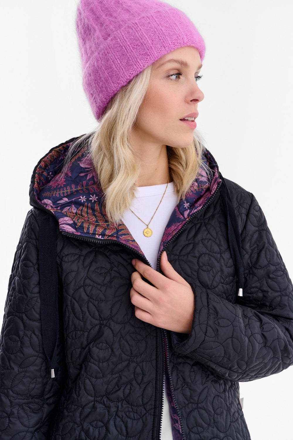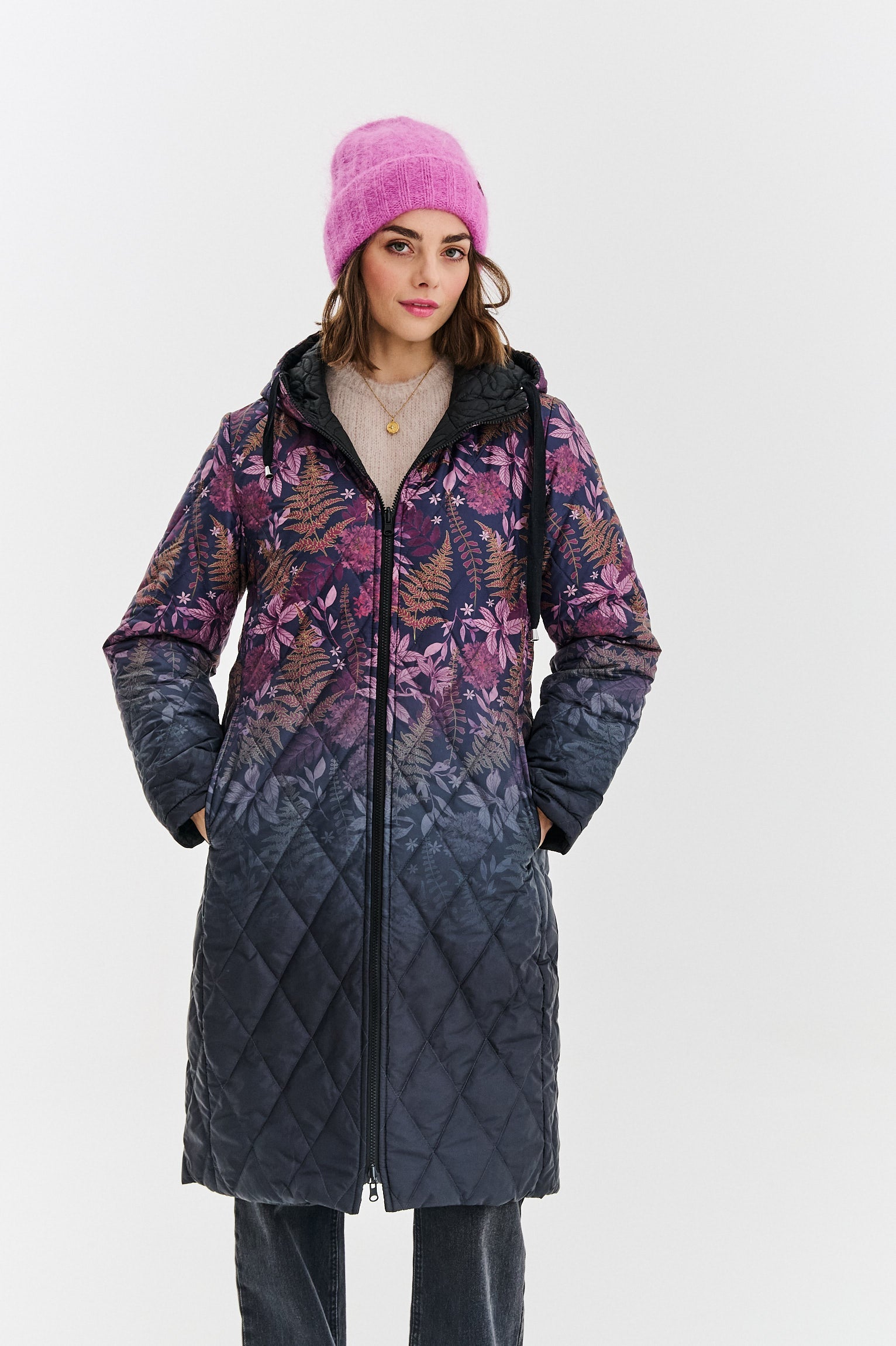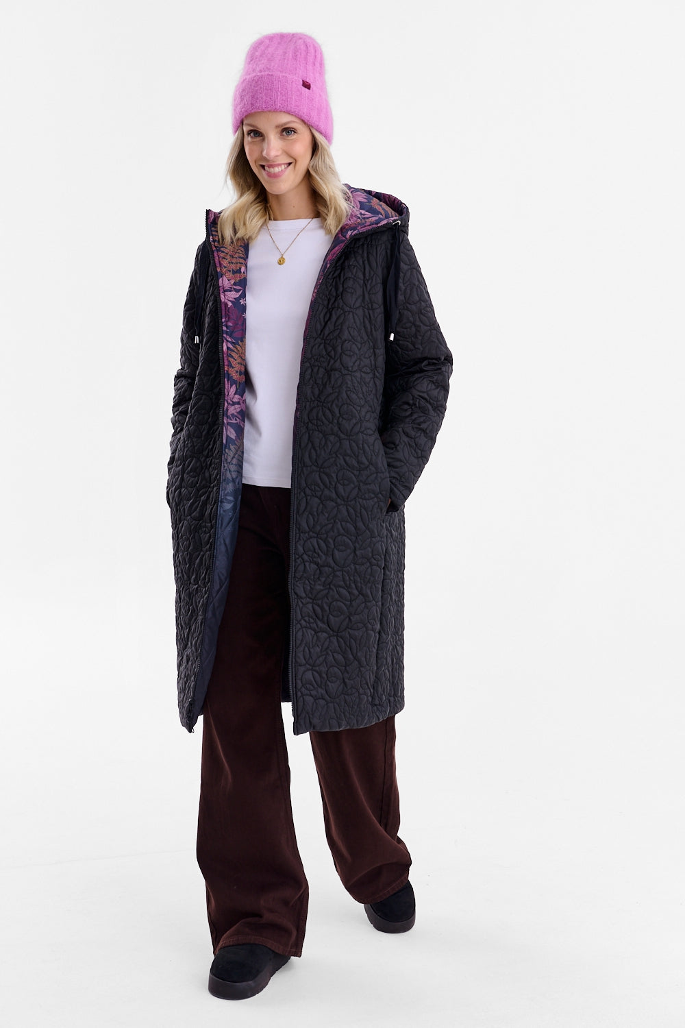 Obojstranný prešívaný kabát Fern Flower je návrh pre romantikov aj minimalistov v jednom. Dlhý, rovný strih s kapucňou poskytuje teplo a pohodlie, zatiaľ čo možnosť prevrátenia robí z tohto kúsku mimoriadne praktický prvok šatníka. Vzorovaná strana oživí každý outfit, zatiaľ čo čierna strana dodá triedu a univerzálnosť.