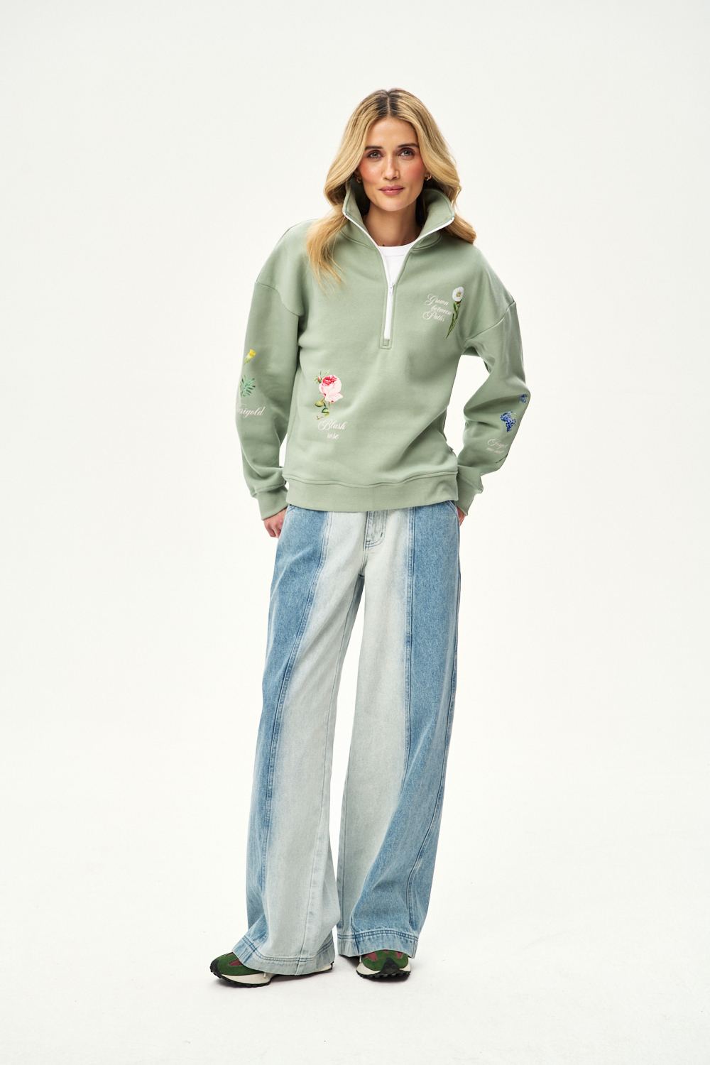 The Lost & Found sweatshirt stands out with its delicate floral graphics, such as forget-me-nots and roses, scattered across the entire surface. A short zipper at the neckline allows you to adjust the collar to your liking.