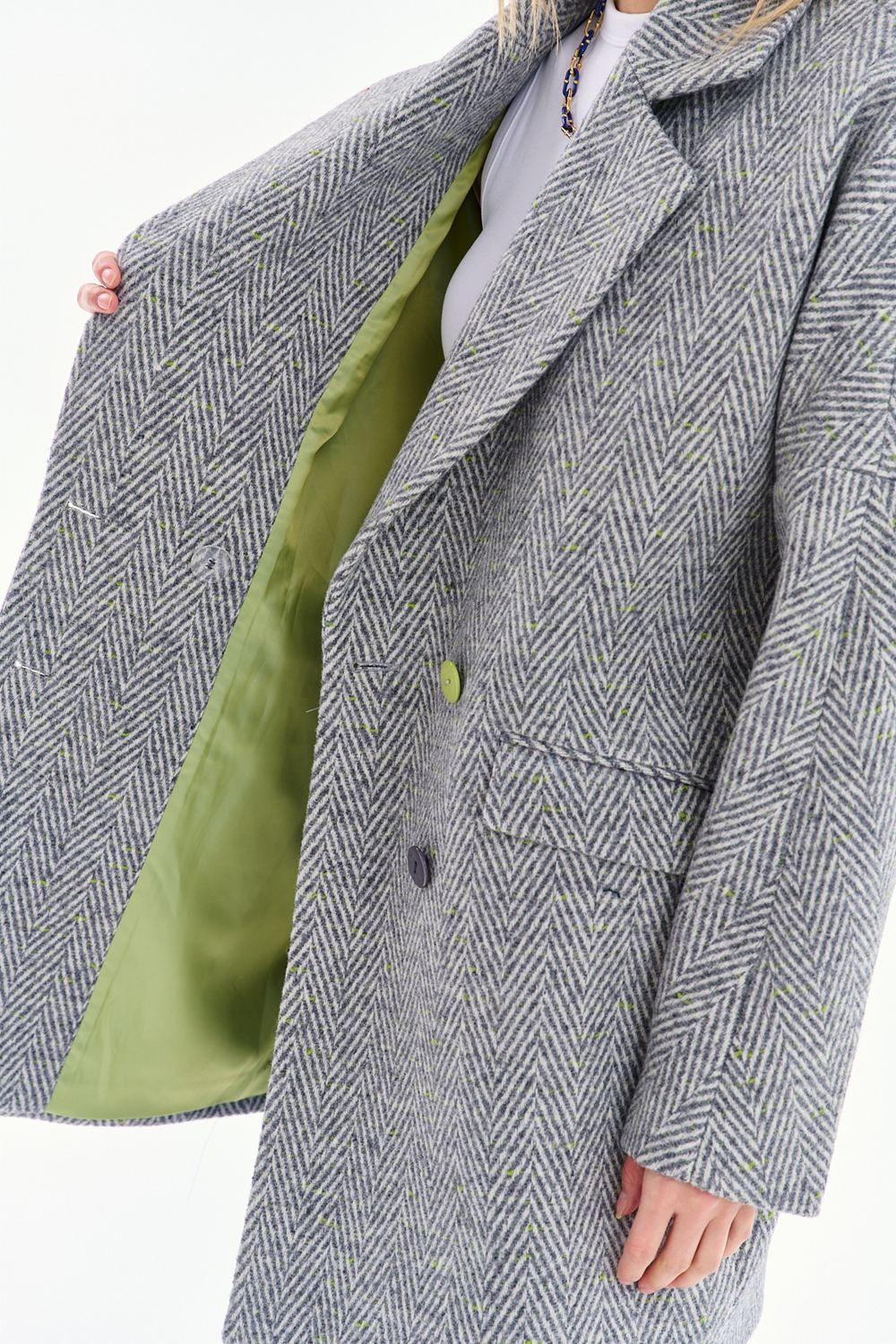 Kabát Minted Shadows je ideálnou voľbou pre milovníkov minimalistických oversize štýlov. Štruktúrovaná látka s rybím vzorom dodáva hĺbku, zatiaľ čo voľný strih zaručuje maximálne pohodlie.