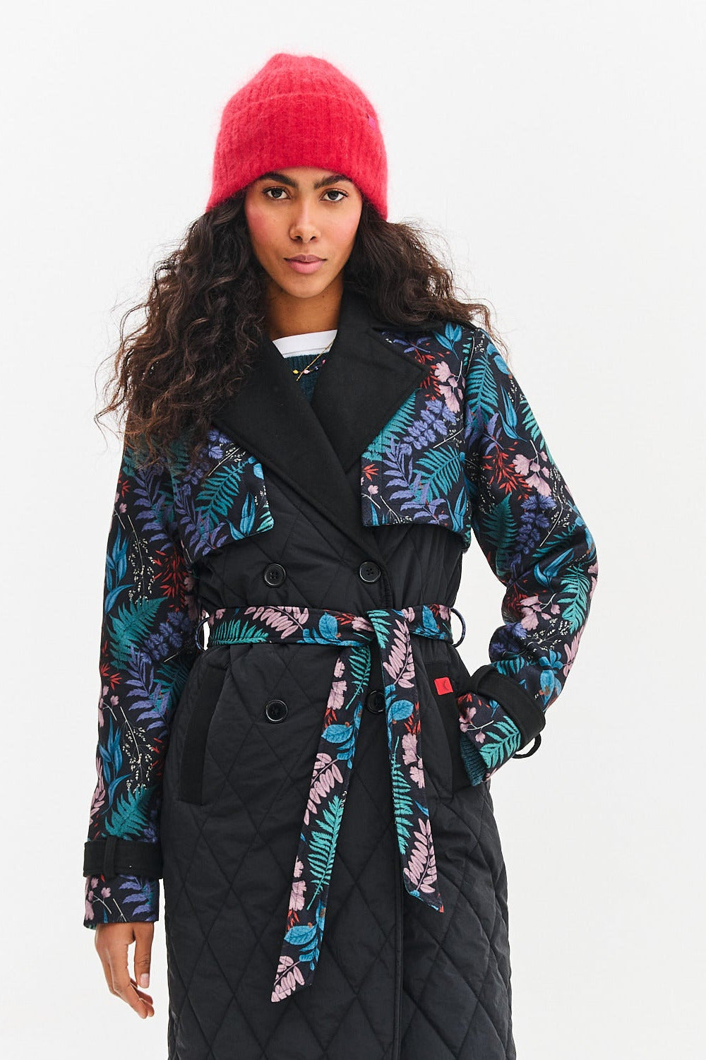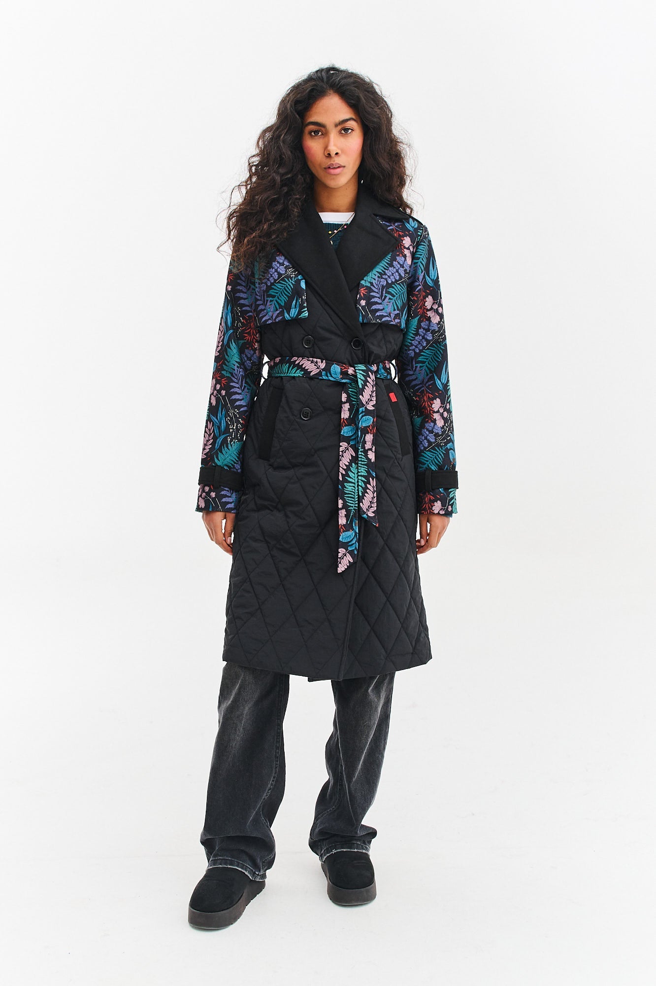 Prešívaný trenčkot Mystery Moss je stelesnením jesennej elegancie. Nadčasový strih trenčkotu s dvojradovým zapínaním a opaskom v páse je obohatený o rukávy so strhujúcim lesným vzorom. Je to dokonalá kombinácia klasiky a najnovších trendov.