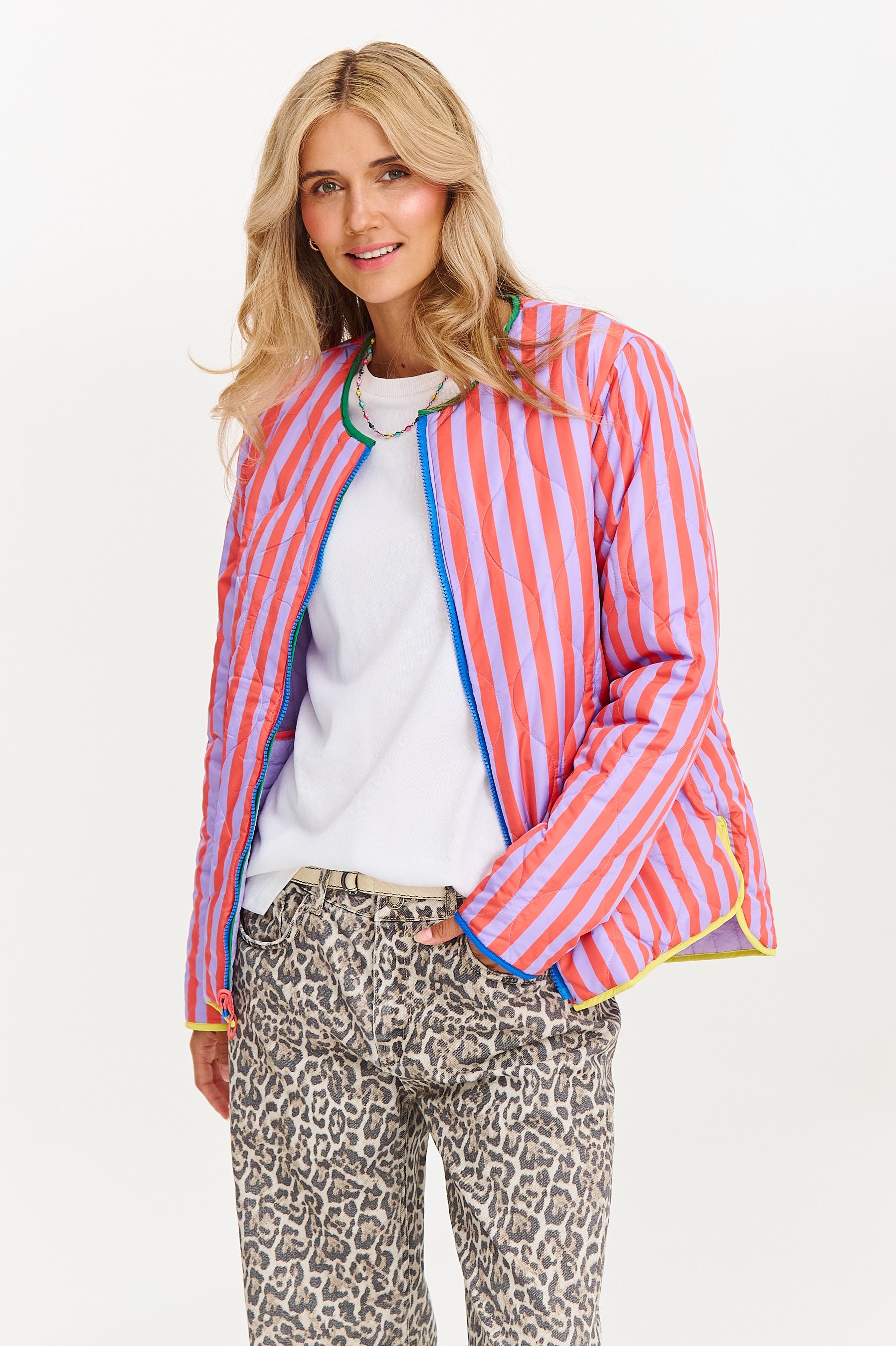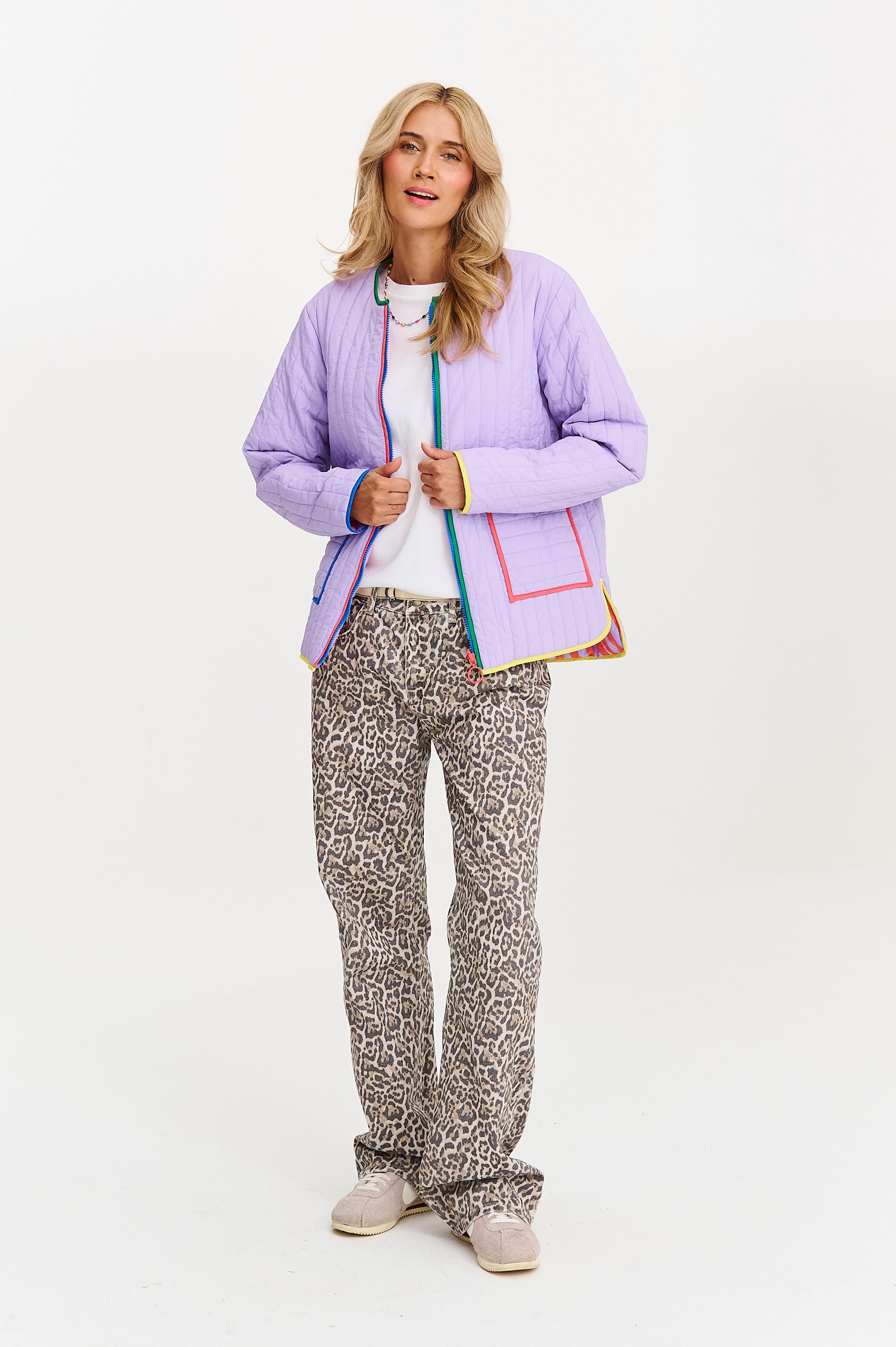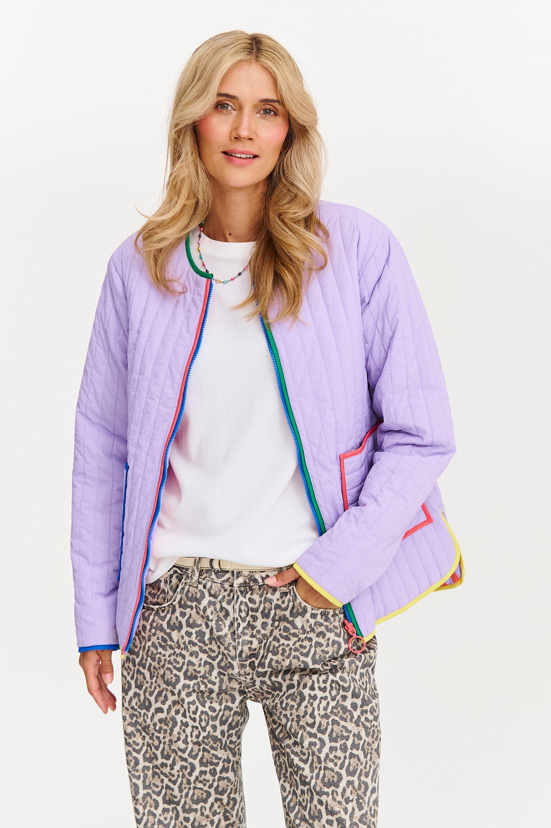 Obojstranná bunda Poppy Lavender Dream je 2 v 1 bunda – jedna strana má fialové prešívanie s farebným lemovaním a našitými vreckami, zatiaľ čo druhá strana má retro vzor s ružovými vlnami a kontrastným zipsom. Môžete ju nosiť podľa nálady – pastelovo a pokojne alebo odvážne a energicky.
