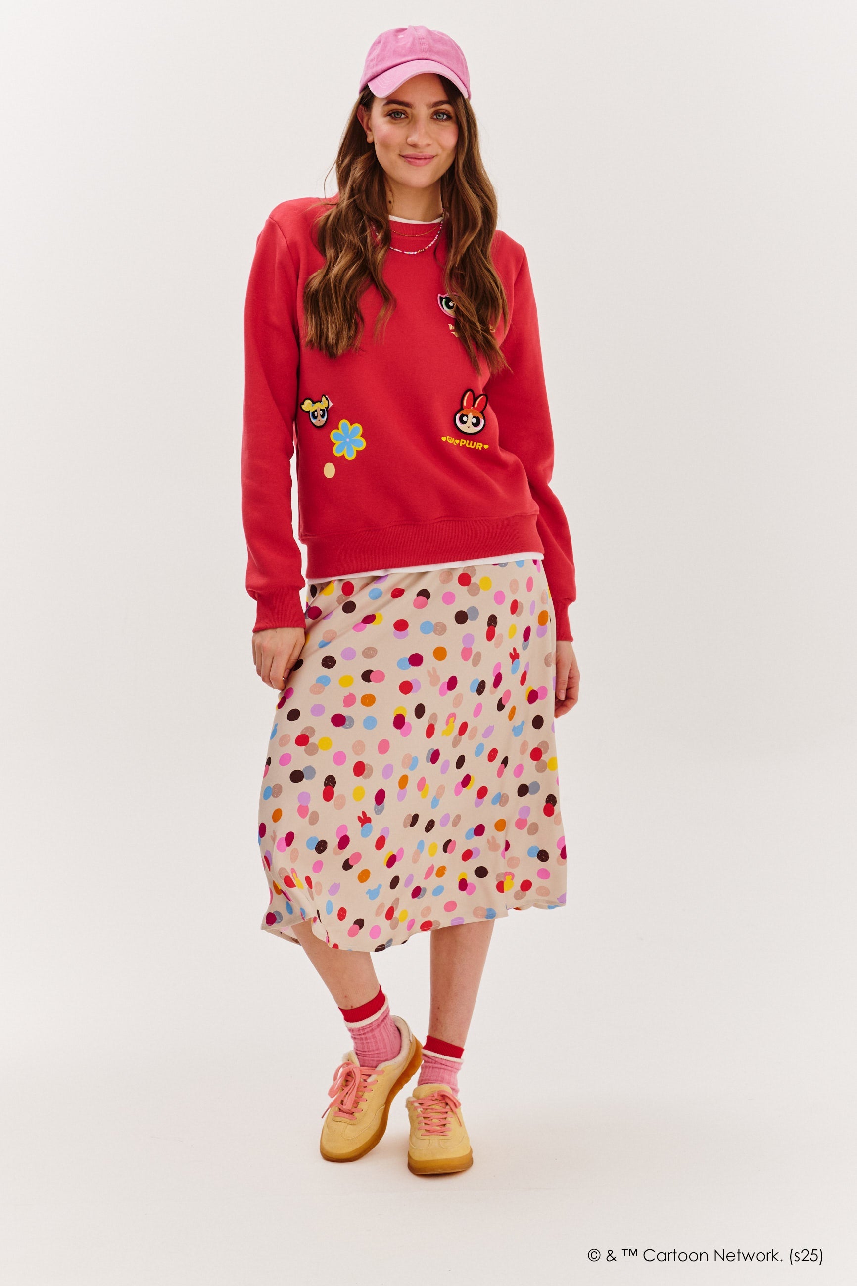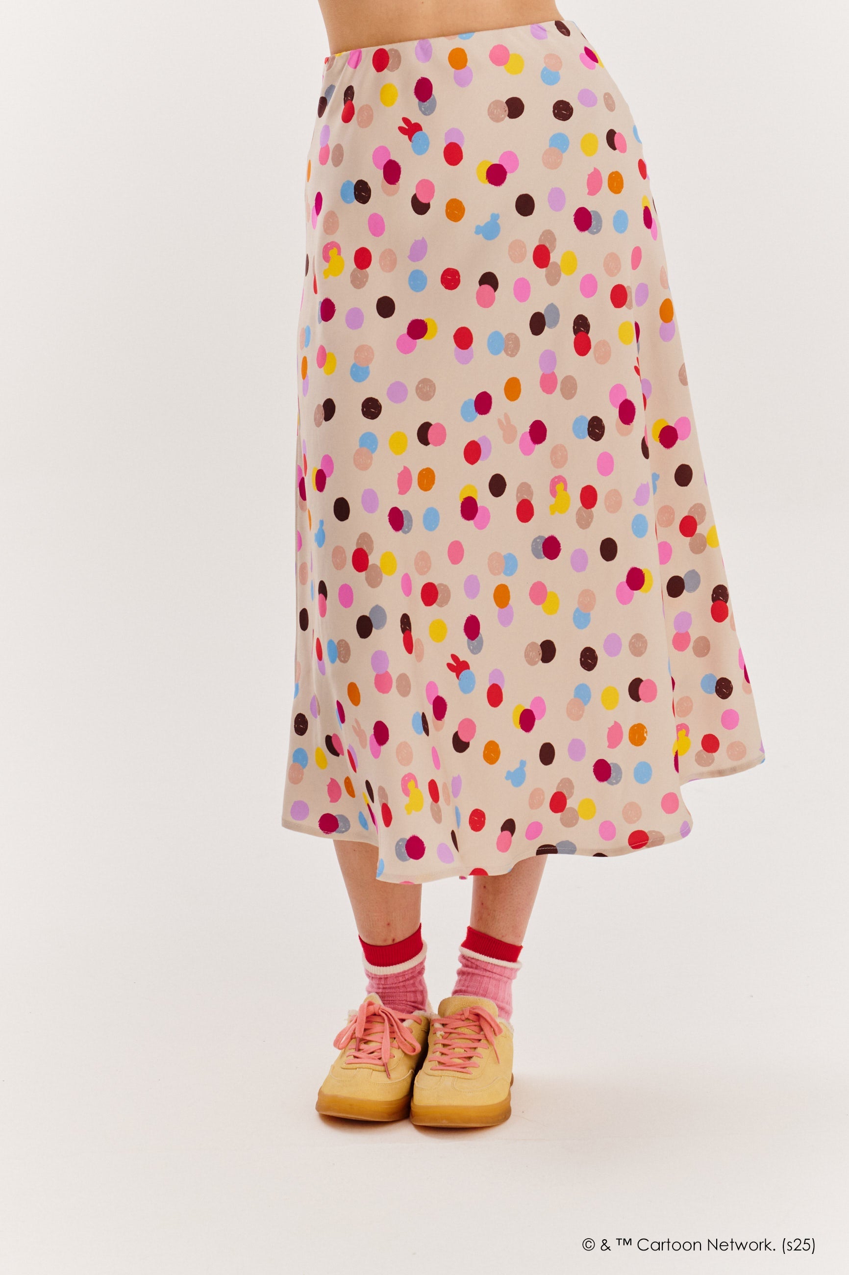 Powerpuff Dots midi sukňa - dievčenská sila v pastelovej verzii! Jedinečná potlač v pestrofarebných bodkách skrýva viac než len zábavné bodky - ak sa pozriete bližšie, nájdete ikonické siluety Powerpuff Girls!