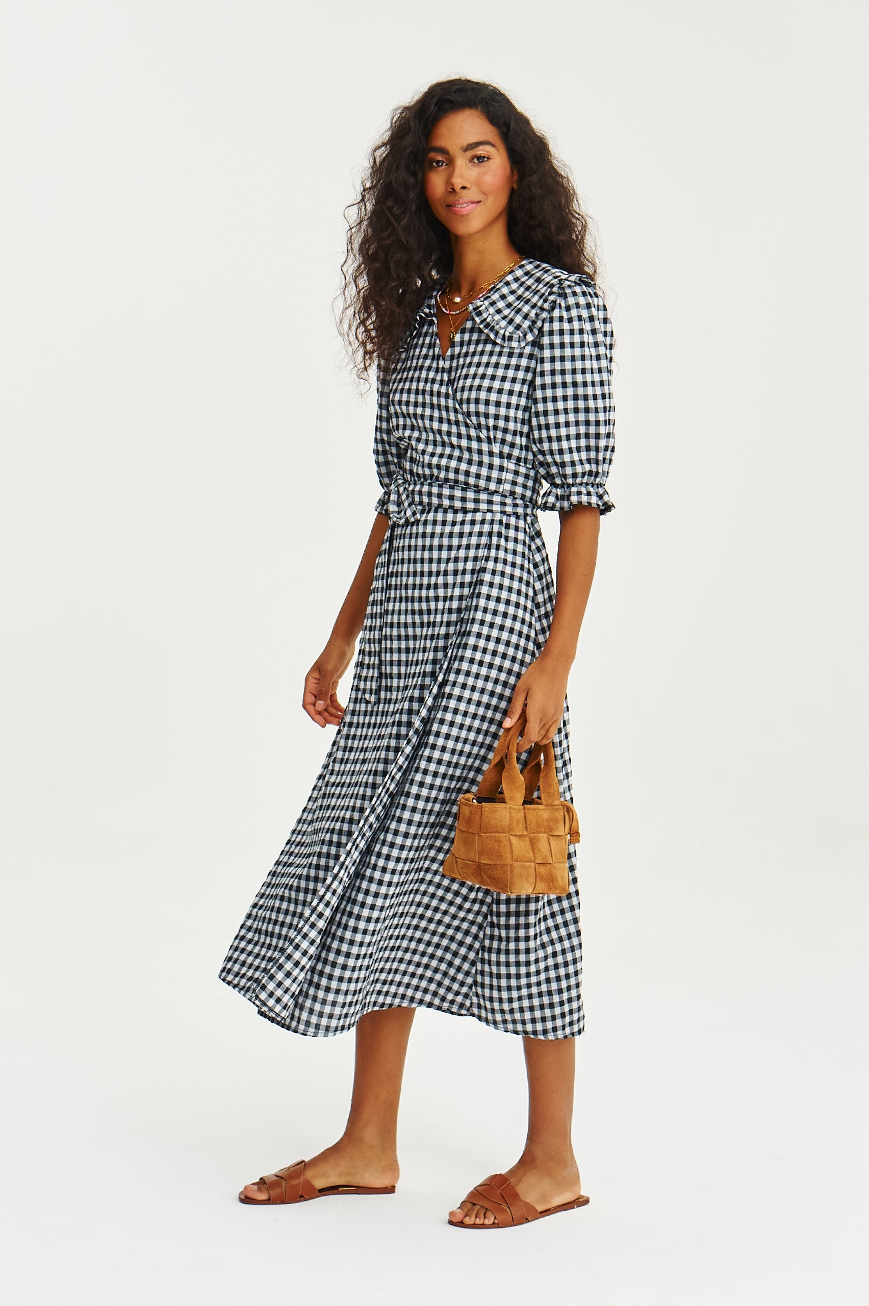 Viazanie v páse vám umožní zdôrazniť siluetu a guma všitá do rukávov dodáva celku mierne balónový, romantický tvar. Čierna kocka na bielom podklade je nadčasový vzor, ktorý nikdy nevyjde z módy a dokonale sa hodí na bežné aj výnimočné príležitosti.