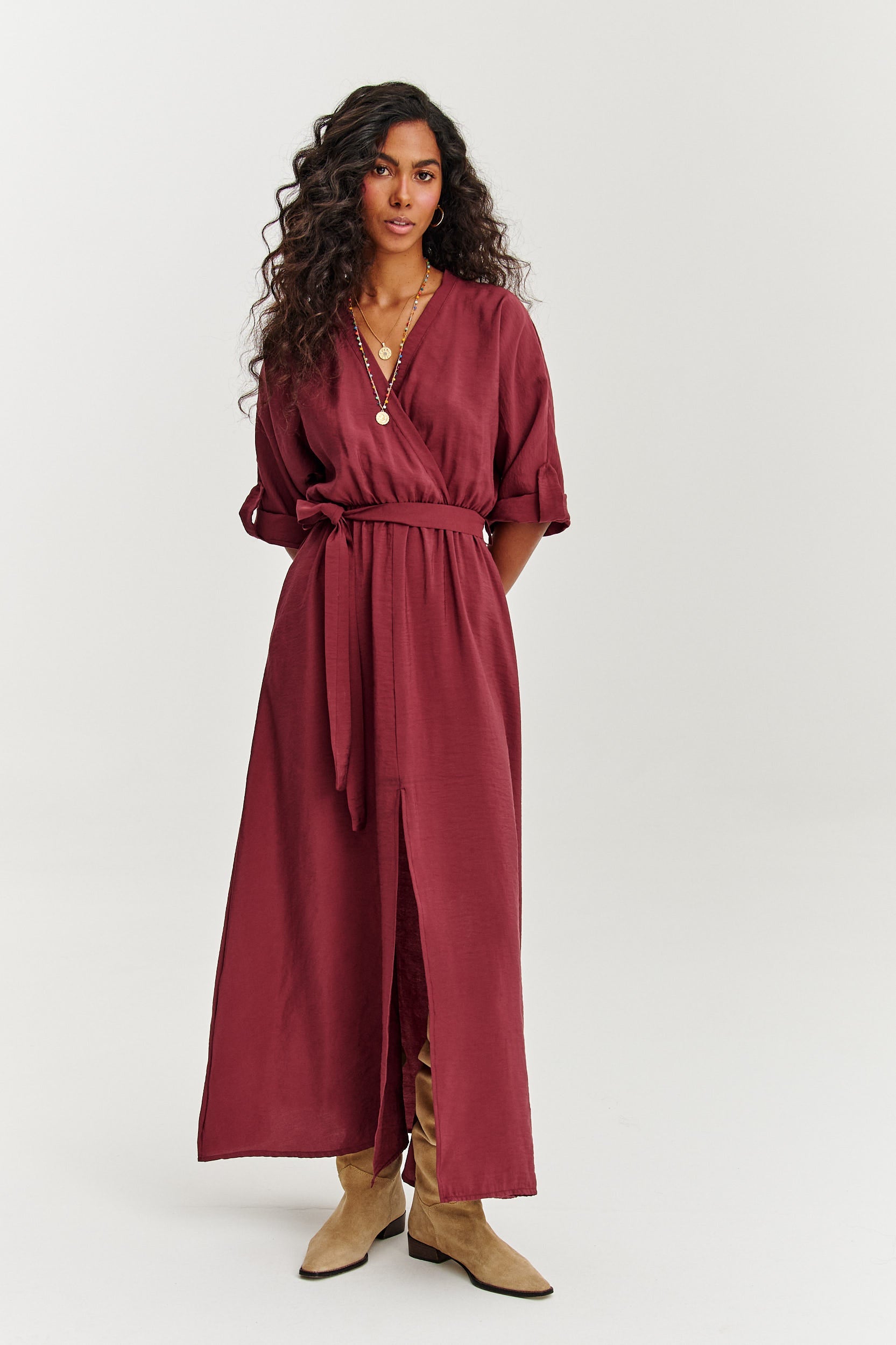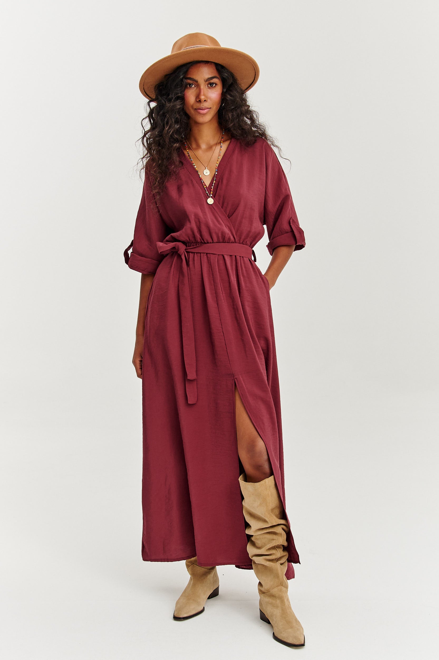 Rosefade dlhé šaty s viazaním sú stelesnením nadčasovej elegancie v boho štýle. Hlboký bordový odtieň priťahuje pohľad, zatiaľ čo zavinovací strih s viazaním jemne zvýrazňuje pás a umožňuje prispôsobiť strih vašej postave. Vzdušný materiál a jemne padajúce rukávy s manžetami dodávajú ľahkosť, zatiaľ čo maxi dĺžka zaručuje pohodlie pri nosení – či už na každý deň, alebo na výnimočné príležitosti.
