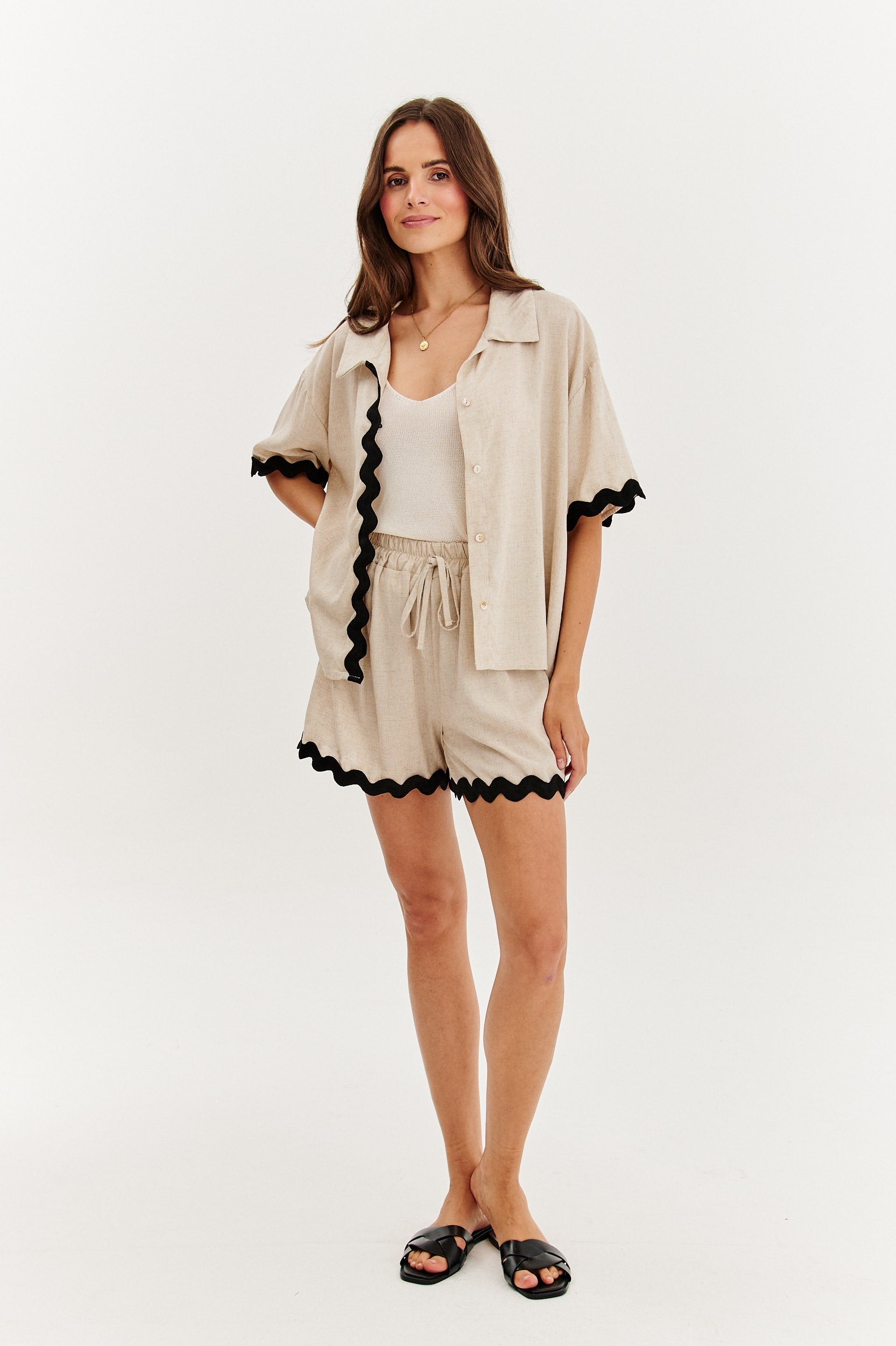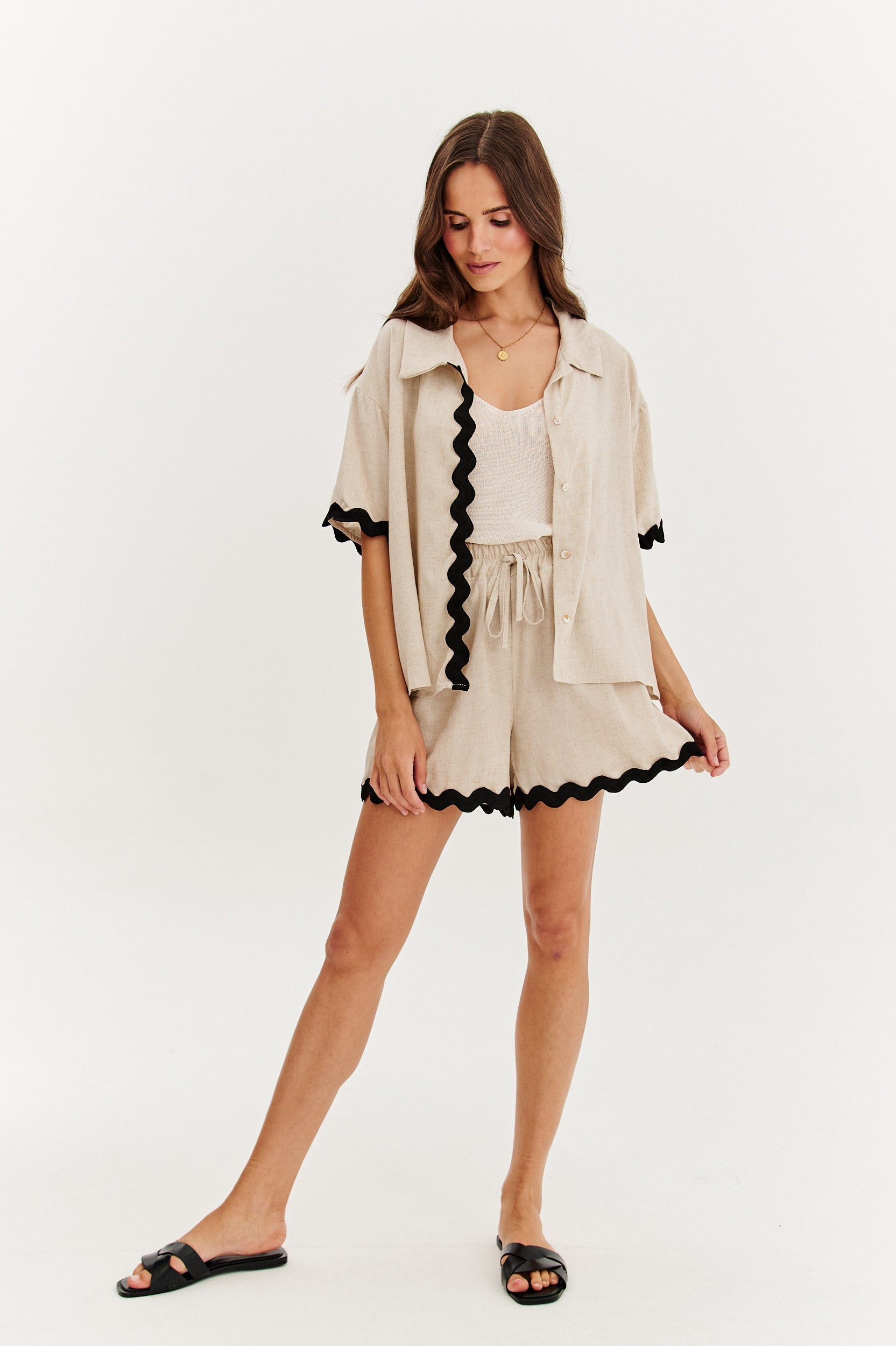 Ľanová košeľa Sandy Toes je ľahký, priedušný kúsok ideálny na teplé dni, ktorý spája prírodný béžový odtieň s dekoratívnymi čiernymi vlnitými lemami. Voľný strih, klasický golier a jemné detaily jej dodávajú jedinečný boho, uvoľnený dovolenkový nádych.