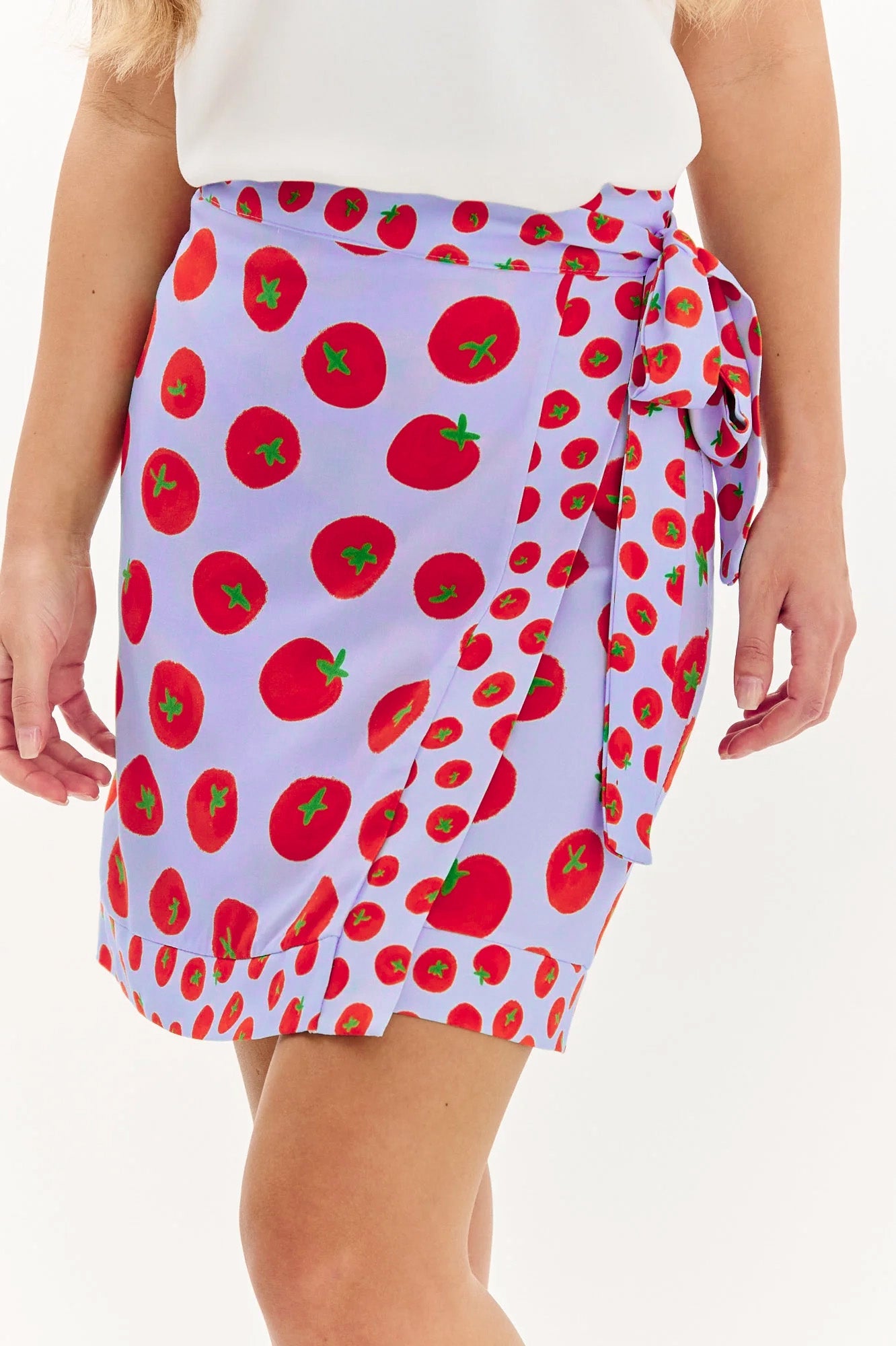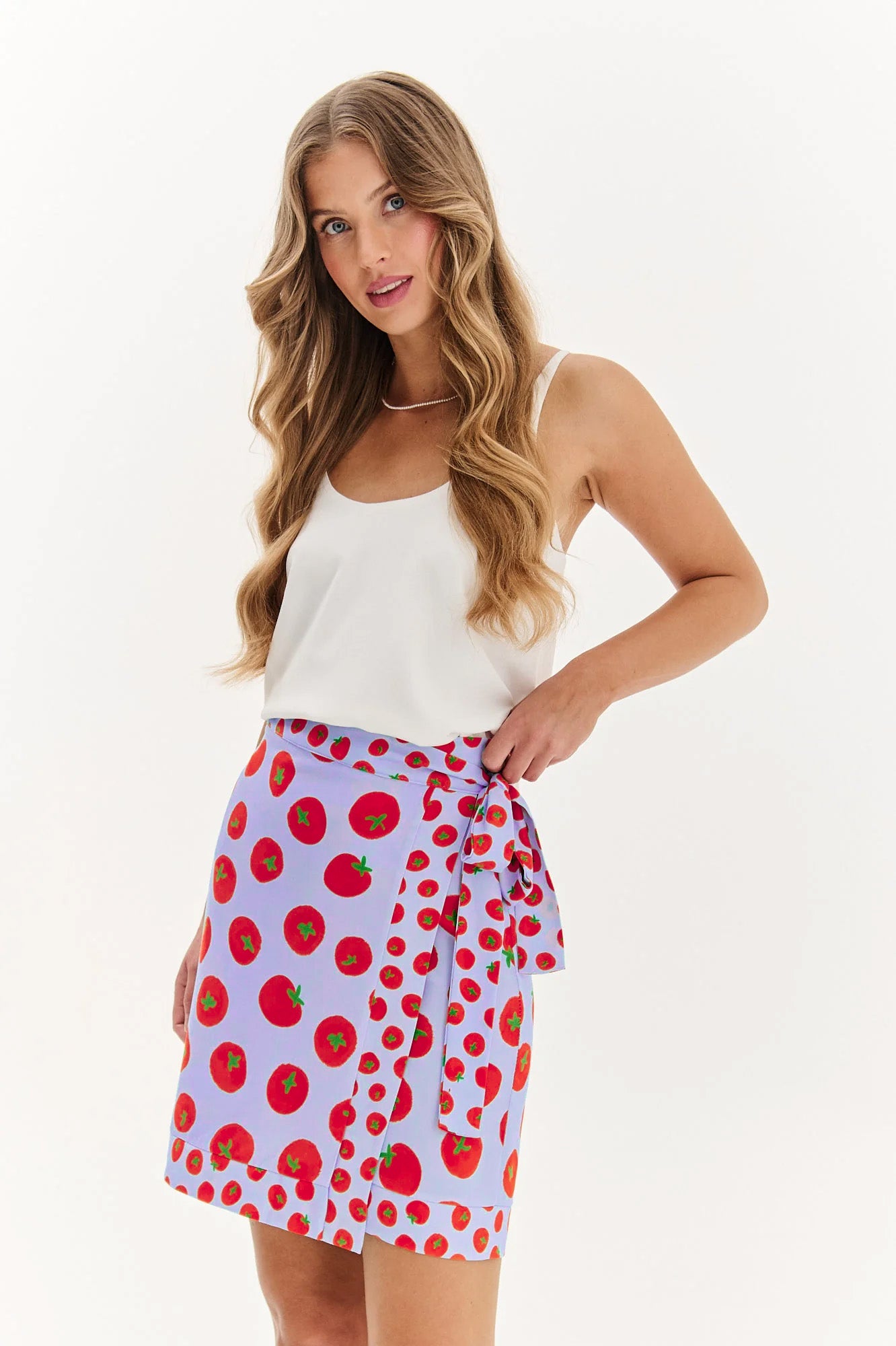 Vyrobená z ľahkej viskózy, je určená na horúce slnečné dni. Dĺžka nad kolená a ležérny zavinovací štýl ju robia ideálnou na kombinovanie s crop topmi alebo plavkami. Kontrastný pás a lem v jemnej paradajkovej potlači pridávajú hravý, nápadný detail.