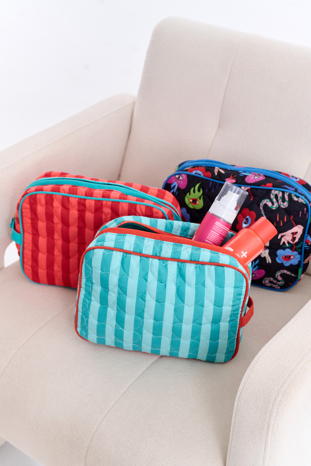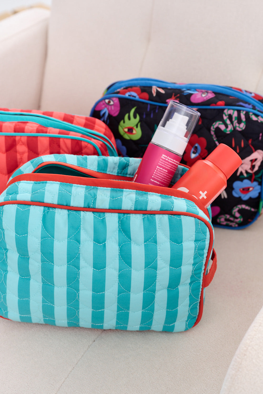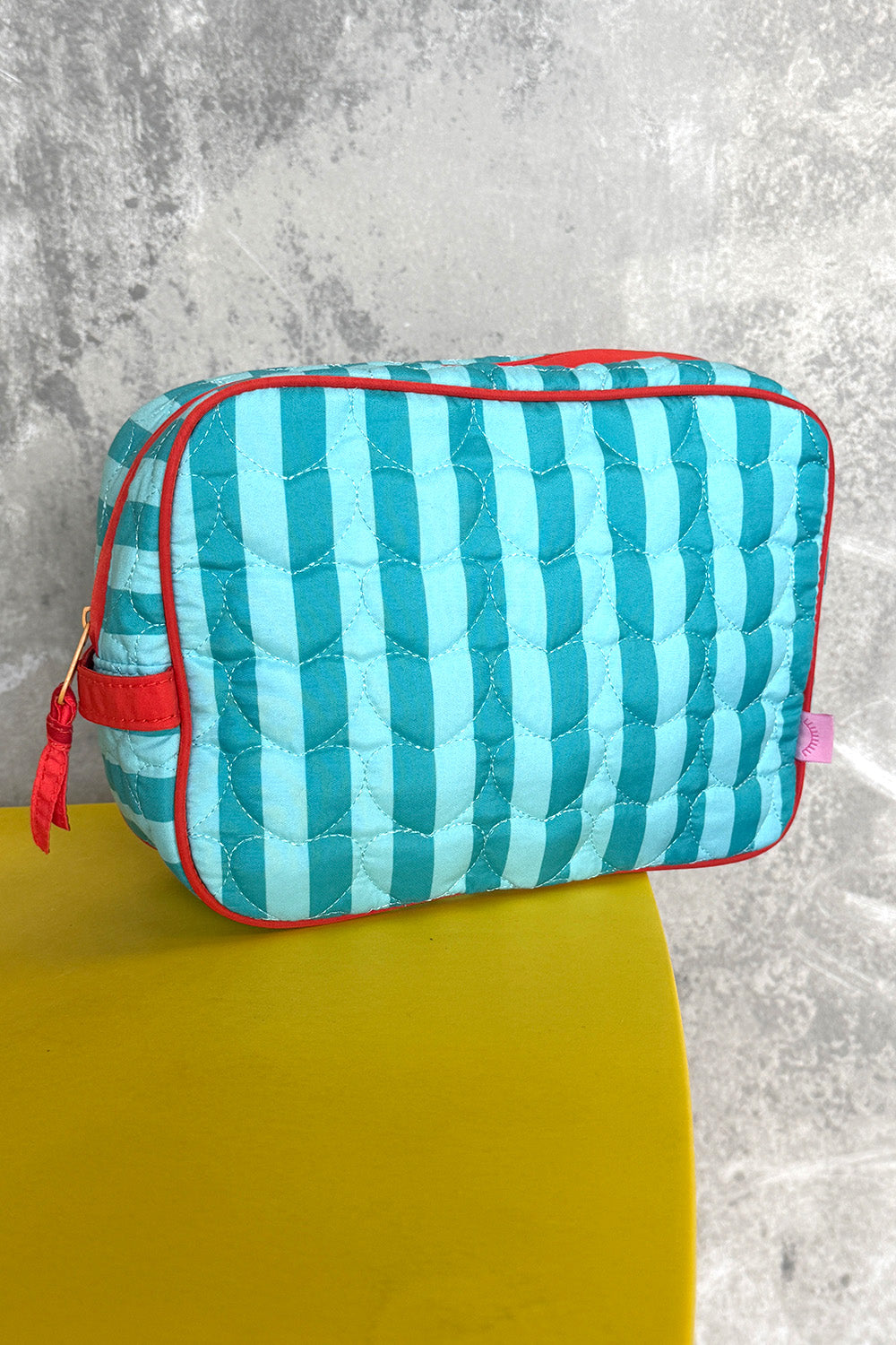 Kozmetická taštička Sugar Pop je dokonalým doplnkom, ktorý prinesie farbu do vašej kúpeľne. Vyrobená z mäkkej, prešívanej látky s dvojfarebnými tyrkysovými pruhmi je rovnako praktická ako štýlová. Zmestia sa do nej všetky vaše obľúbené kozmetické produkty a doplnky.