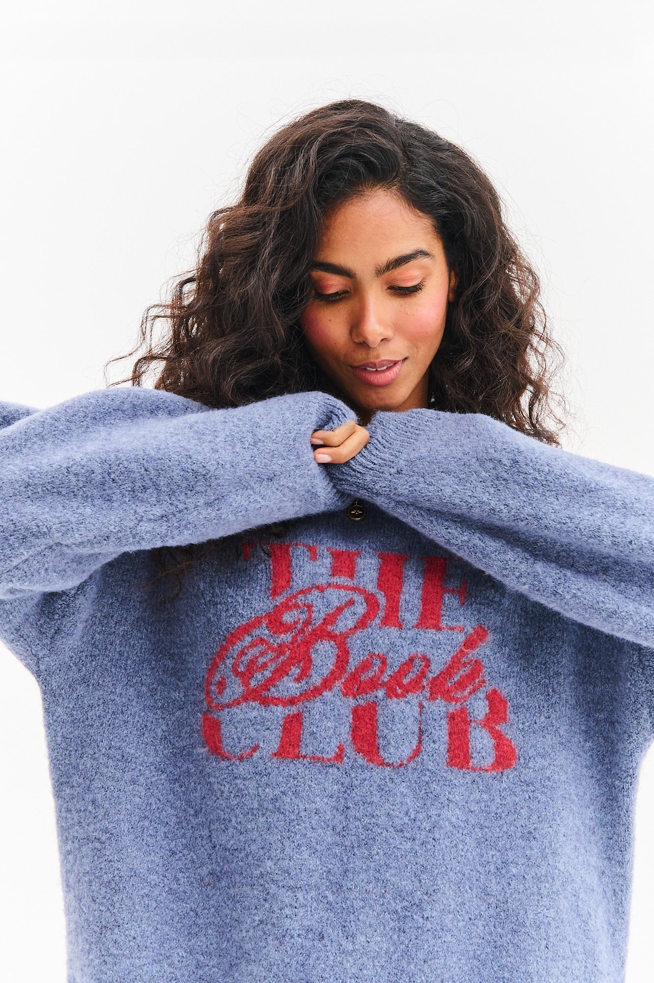 Book Club Lover sweater is a manifesto of love for reading. Its loose, oversized cut provides maximum comfort, and the large, red retro-style inscription on the front proudly proclaims membership in the book lover's club. The whole design is kept in a calm gray-blue color.