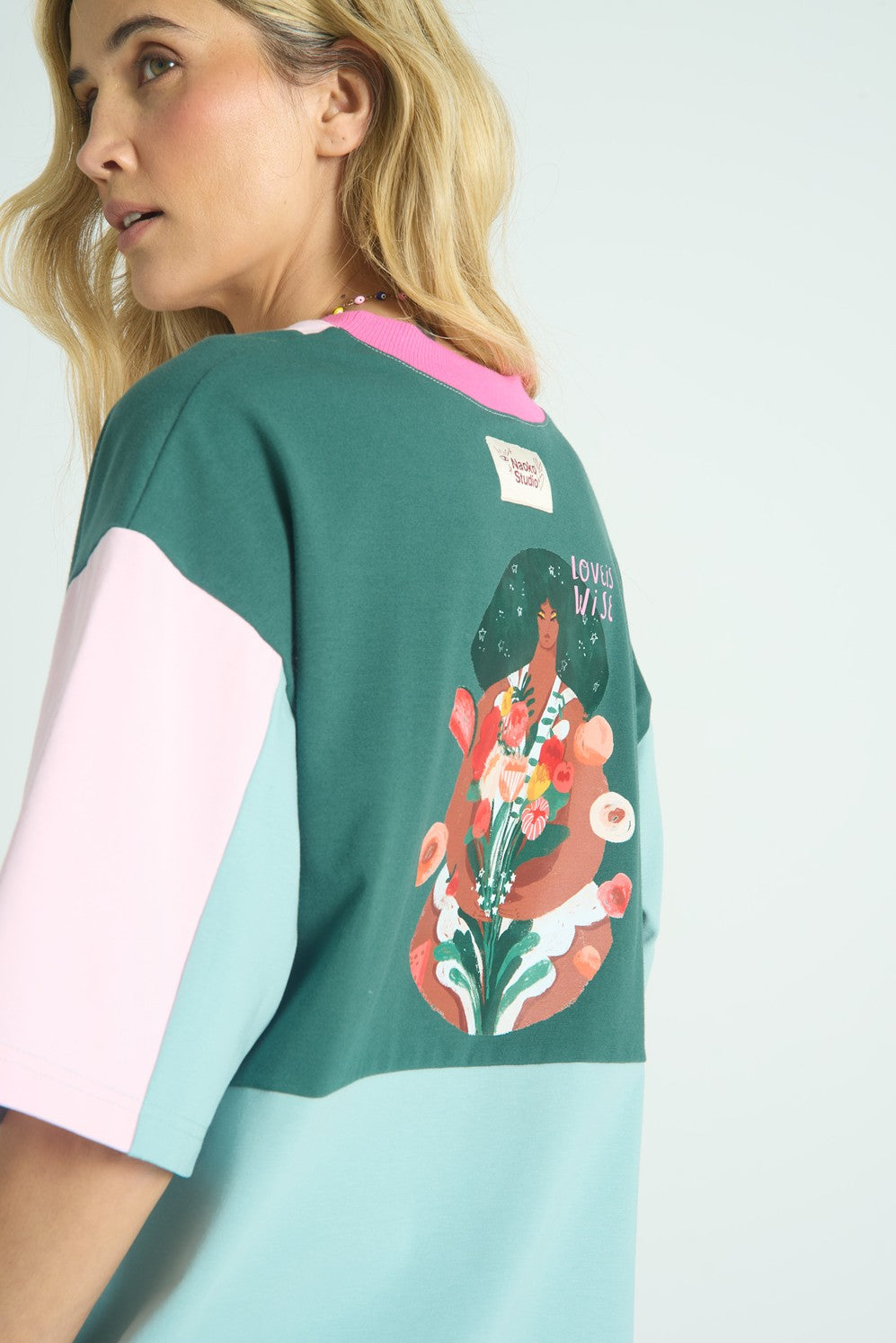 Na hrudi je otázka „Ako dnes rastieš?“, zatiaľ čo na chrbte je maliarska ilustrácia ženy s náručou kvetov a slogan „Love is Wise“. Je to umelecká odpoveď na otázku, čo chceme pestovať: starostlivosť o seba, rast a lásku. Výberom tohto modelu podporujete Nadáciu Kosmos pre dievčatá.