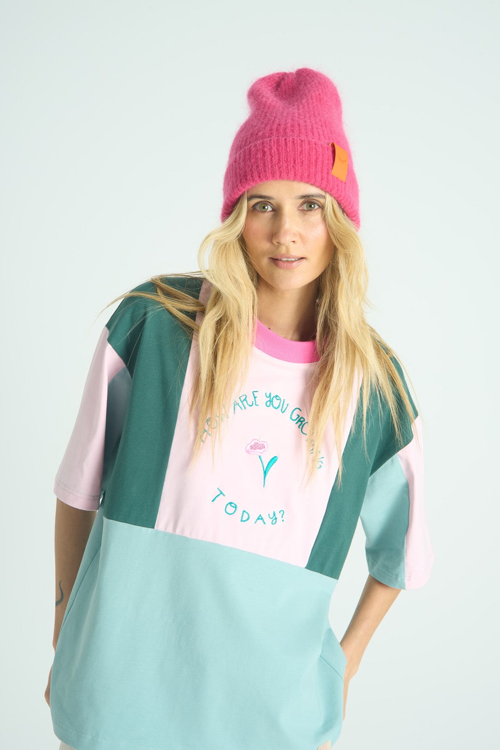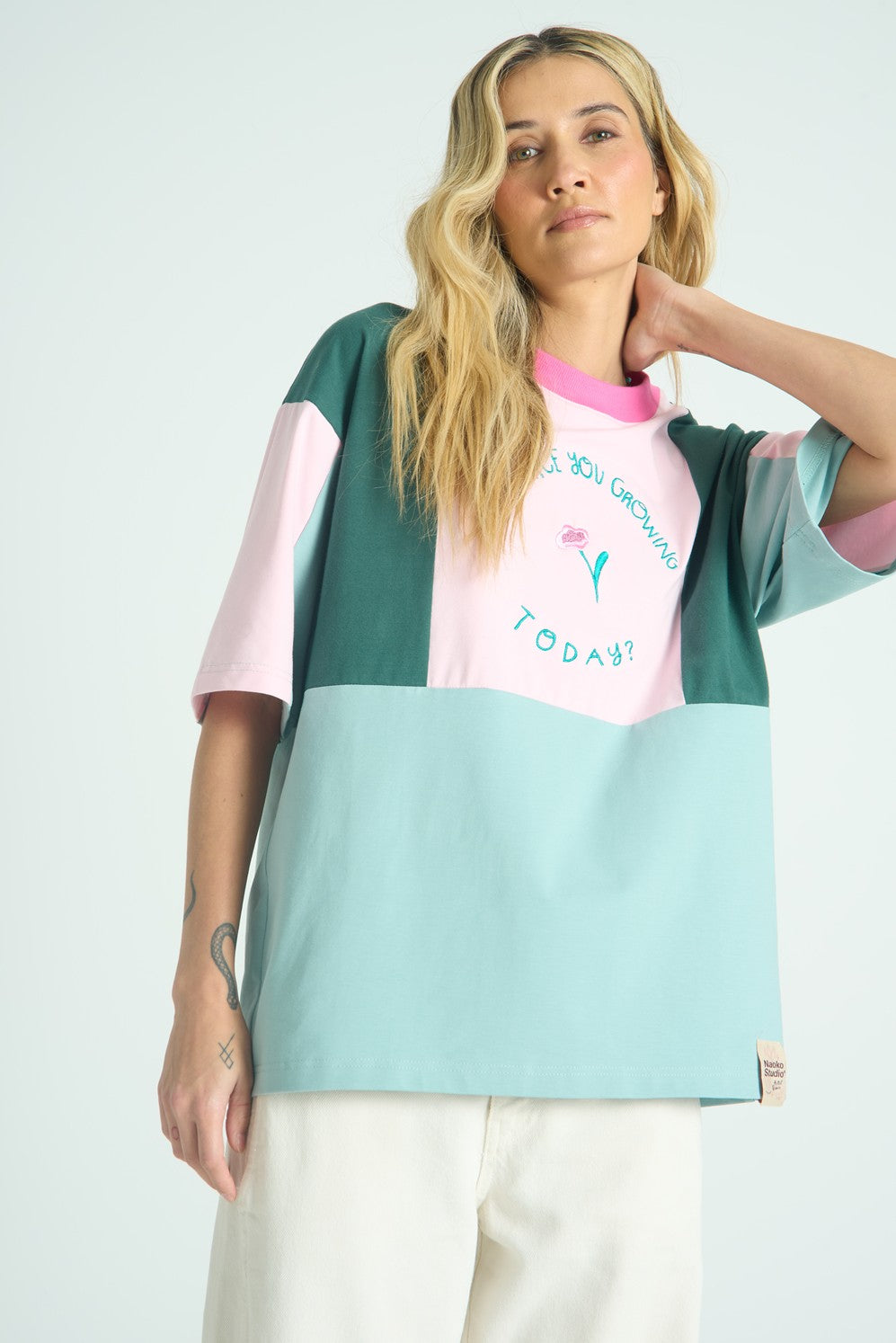 Tričko How Are You je nežnou pripomienkou toho, na čom v živote najviac záleží. Navrhla ho Loveis Wise v rámci projektu Naoko x Artist Remix a spája jemné pastelové farby s hlbokou zelenou. Oversize strih a farebné panely vytvárajú harmonický, priateľský celok.