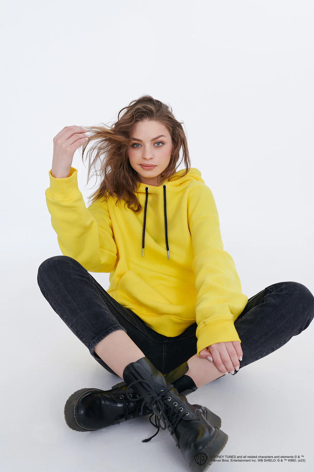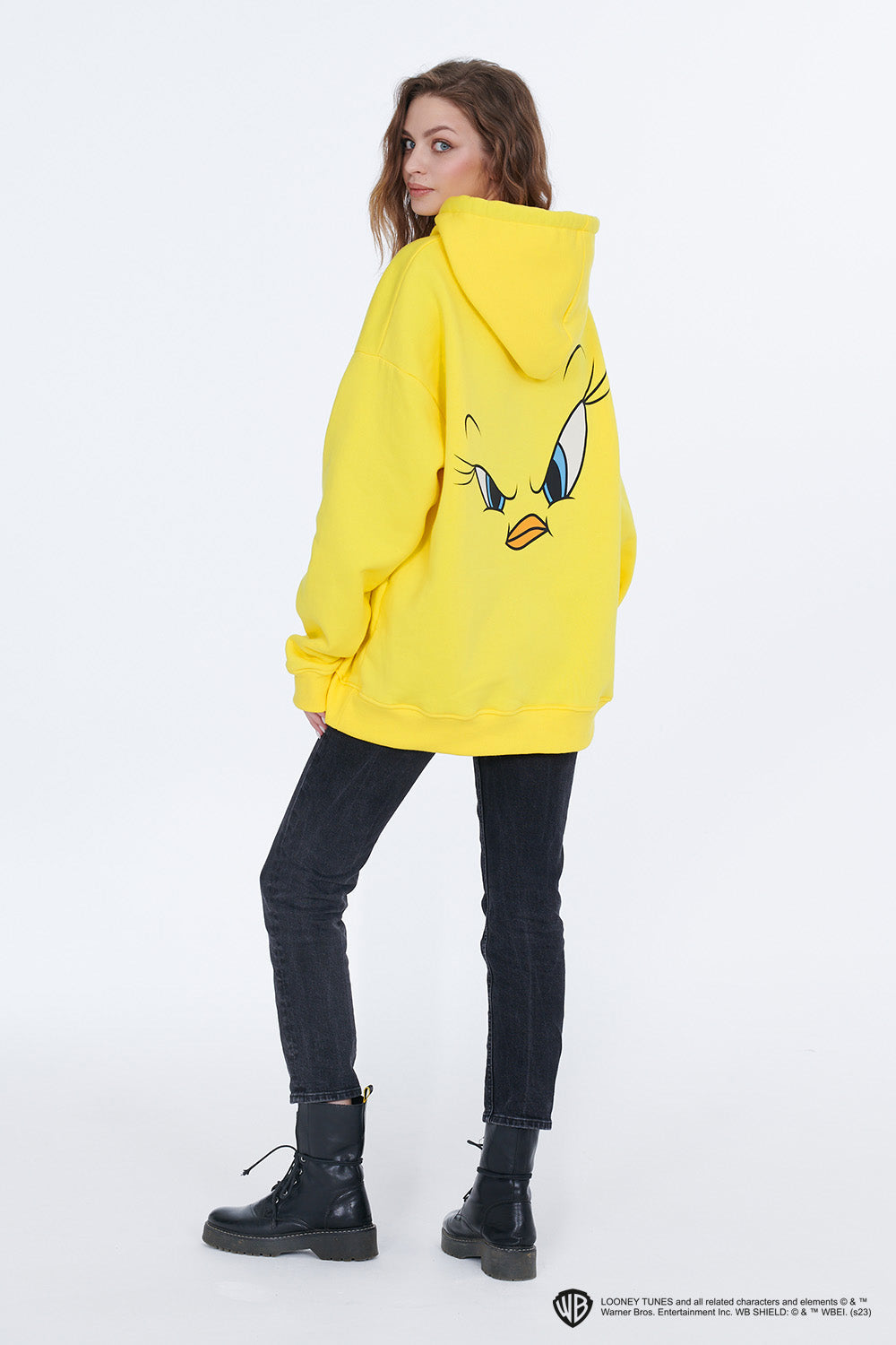 Mikina Tweety – v nej pocítite neuveriteľný príval energie a pozitívnej nálady. Ani to nemôže byť inak, ak máte na sebe intenzívne žltú, mierne oversize mikinu s kanárikom Tweety na chrbte. Na zadnej strane mikiny sú aplikované iba tvár, oči a zobák kanárika. Zvyšok kanárika tvorí... vlastne celú mikinu.