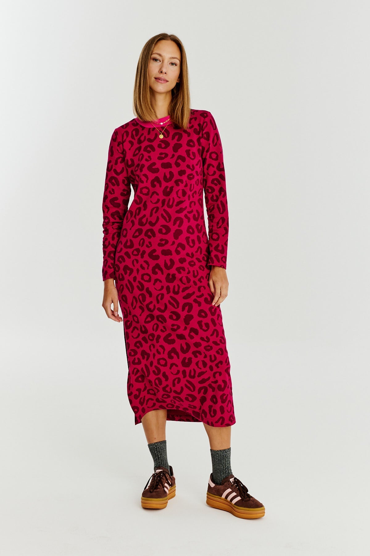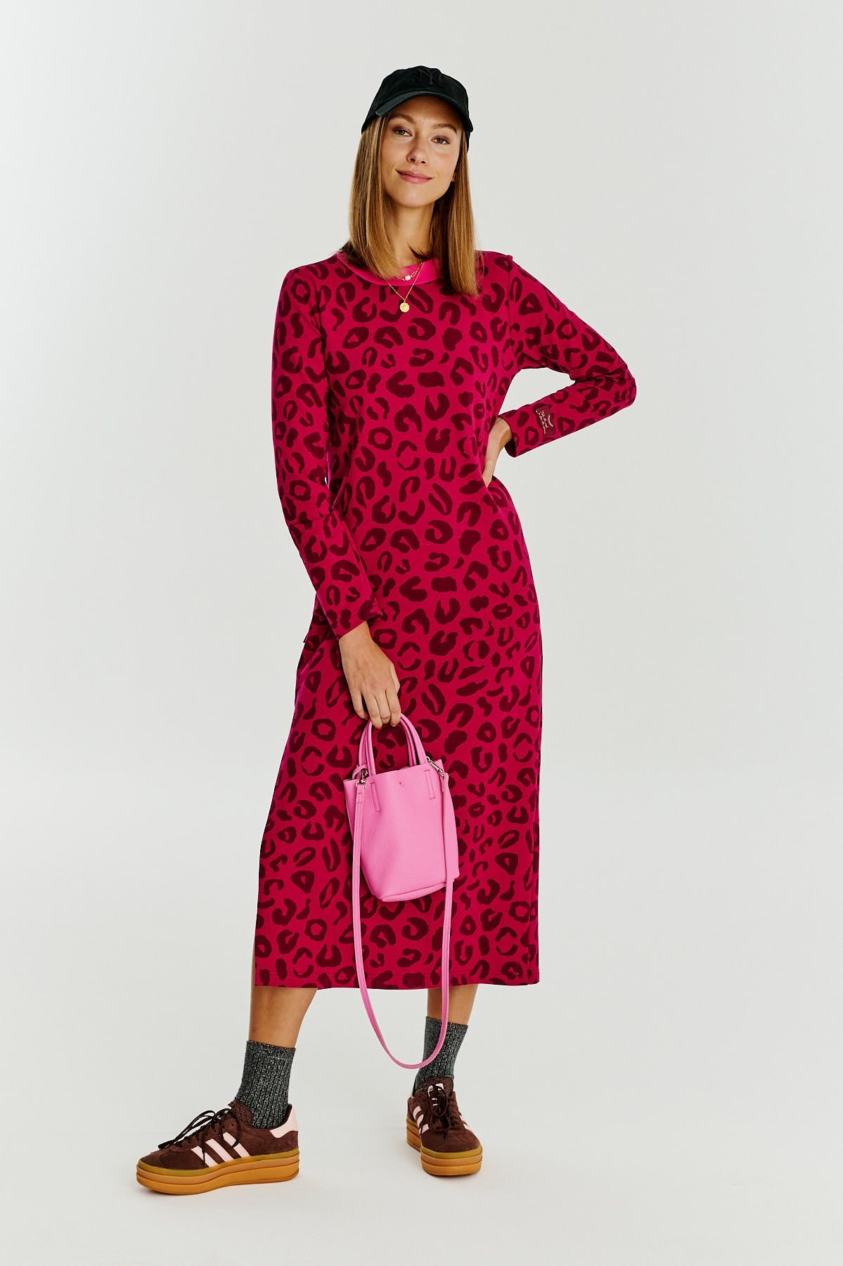 Pletené šaty Wild Maroon sú jedinečnou ponukou pre milovníkov odvážnych vzorov a pohodlia. Vyrobené z mäkkej pleteniny, zdobí ich výrazná leopardia potlač v odtieňoch tmavočervenej a fialovej.