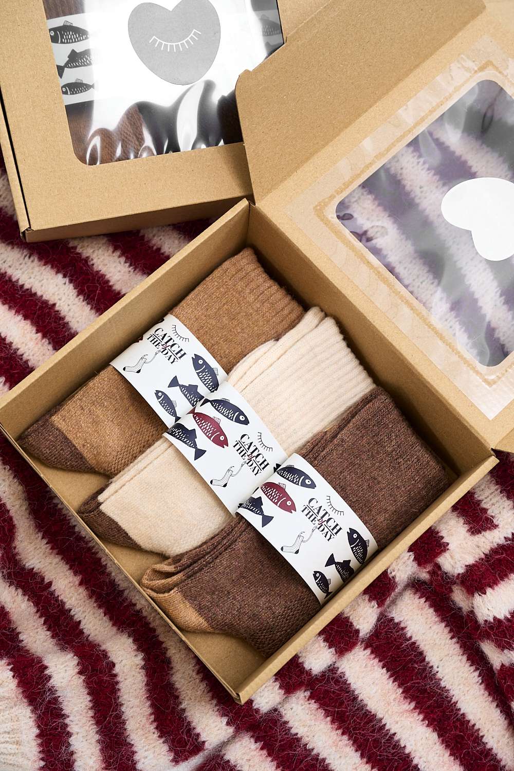 Súprava ponožiek z vlny a kašmíru Breathe First je stelesnením pohodlia v zemitých tónoch. Súprava obsahuje tri páry ponožiek, ktoré dokonale doplnia zimné outfity. Vysokokvalitná priadza zaručuje teplo a štýlová grafika rybej kosti na leme dodáva charakter.